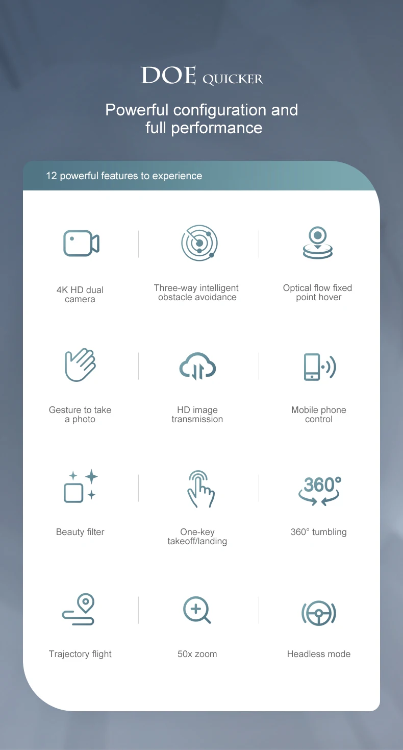 Трехстороннее избегание препятствий, переключение с двумя камерами, режим удержания высоты, складной самолет, взлет одной кнопкой, подъем и убывание, вперед и назад, полет влево и вправо, рулевое управление, безголовый режим (с камерой можно добавить функции: фото жестов, видео, Безголовый режим, траектория полета, датчик силы тяжести, автоматическое фото)