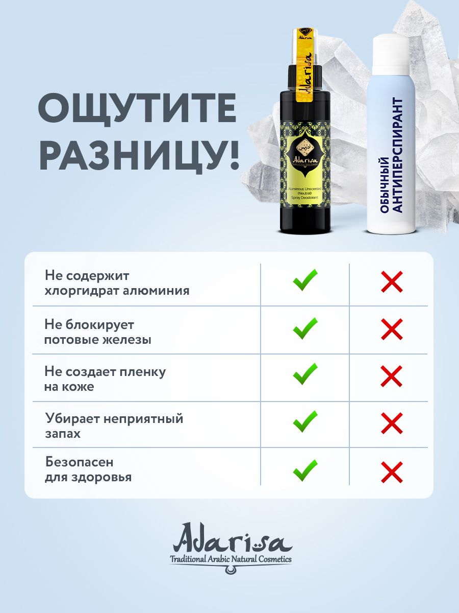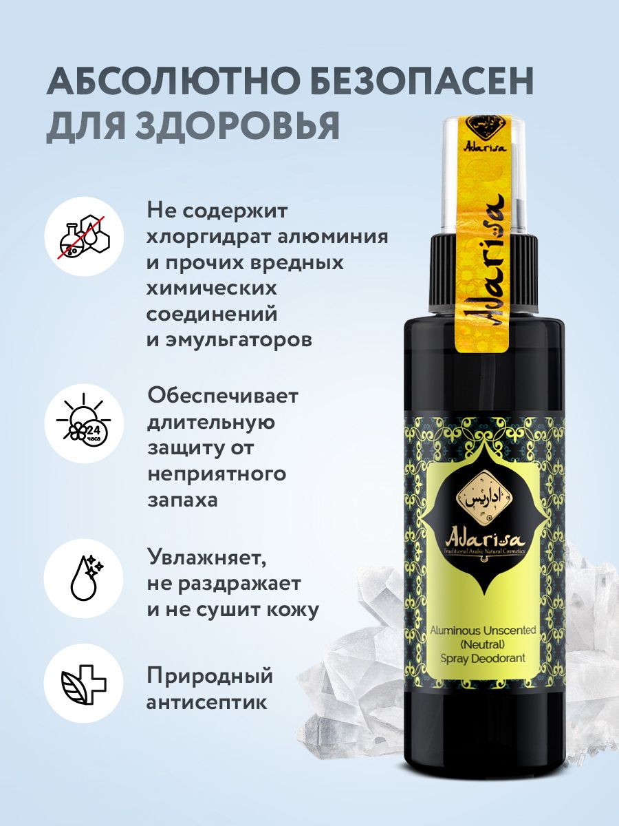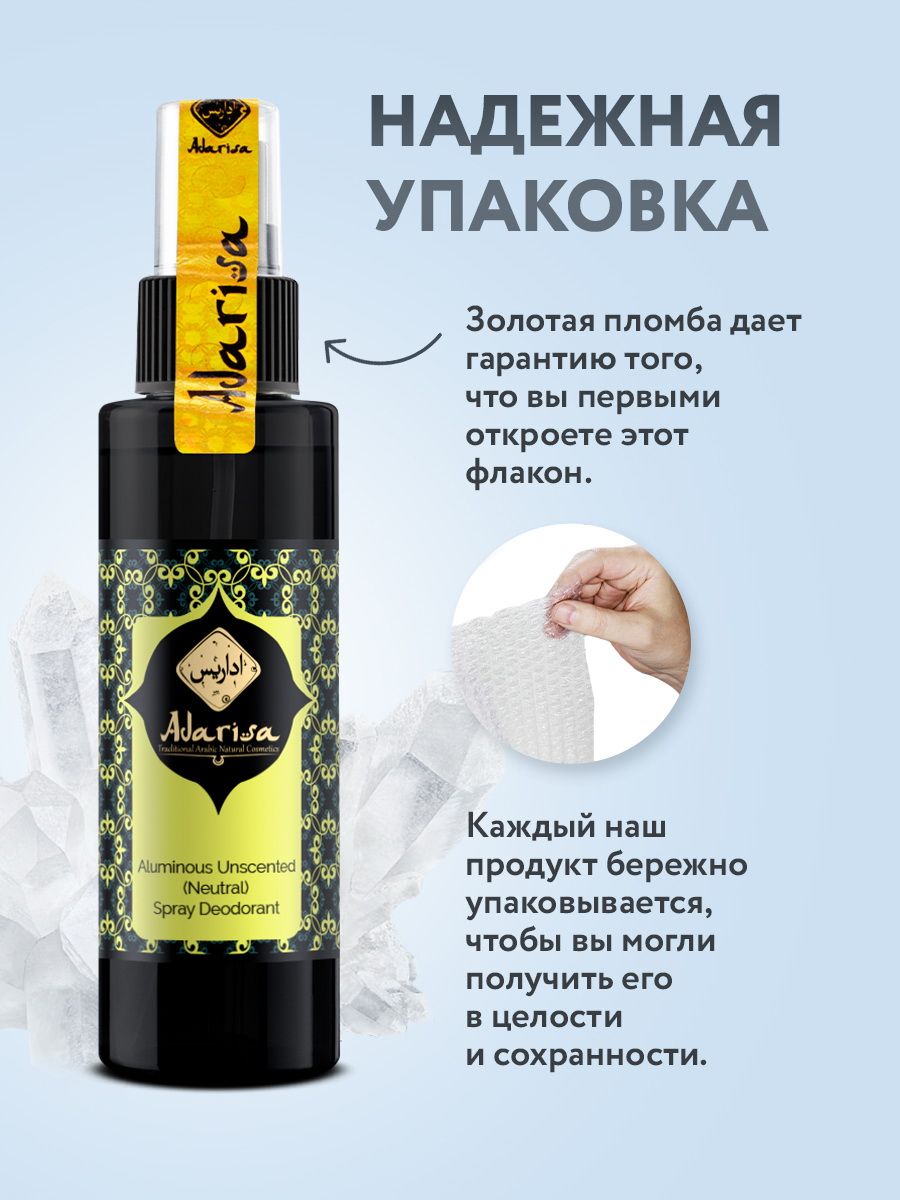 Описание: Натуральный квасцовый дезодорант "Adarisa" представляет собой самую безопасную альтернативу синтетическим антиперспирантам. Основа дезодоранта - калиевые квасцы. Эти 100% натуральные компоненты обладают уникальными свойствами, которые позволяют применять их для стойкой защиты от пота на протяжении всего дня. Калиевые квасцы – минералы горно-вулканического происхождения. Контактируя с водой, они образуют на коже тонкую невидимую оболочку, которая позволяет регулировать потоотделение и нейтрализовать возникающий запах без засорения пор или какого-либо другого вреда для кожи. Квасцовый дезодорант абсолютно гипоаллергенен, поэтому он не вызывает красноту и раздражения на коже. Это идеальное средство для тех, кого беспокоят слишком резкие или приторные парфюмерные отдушки.