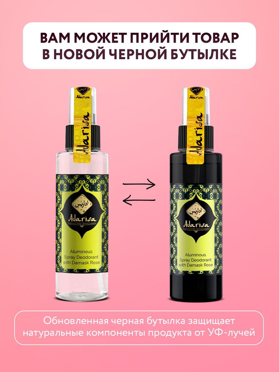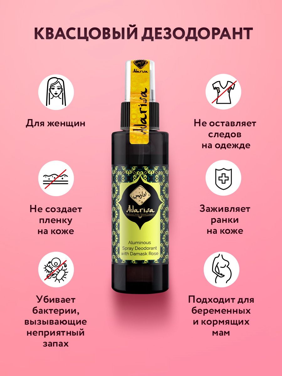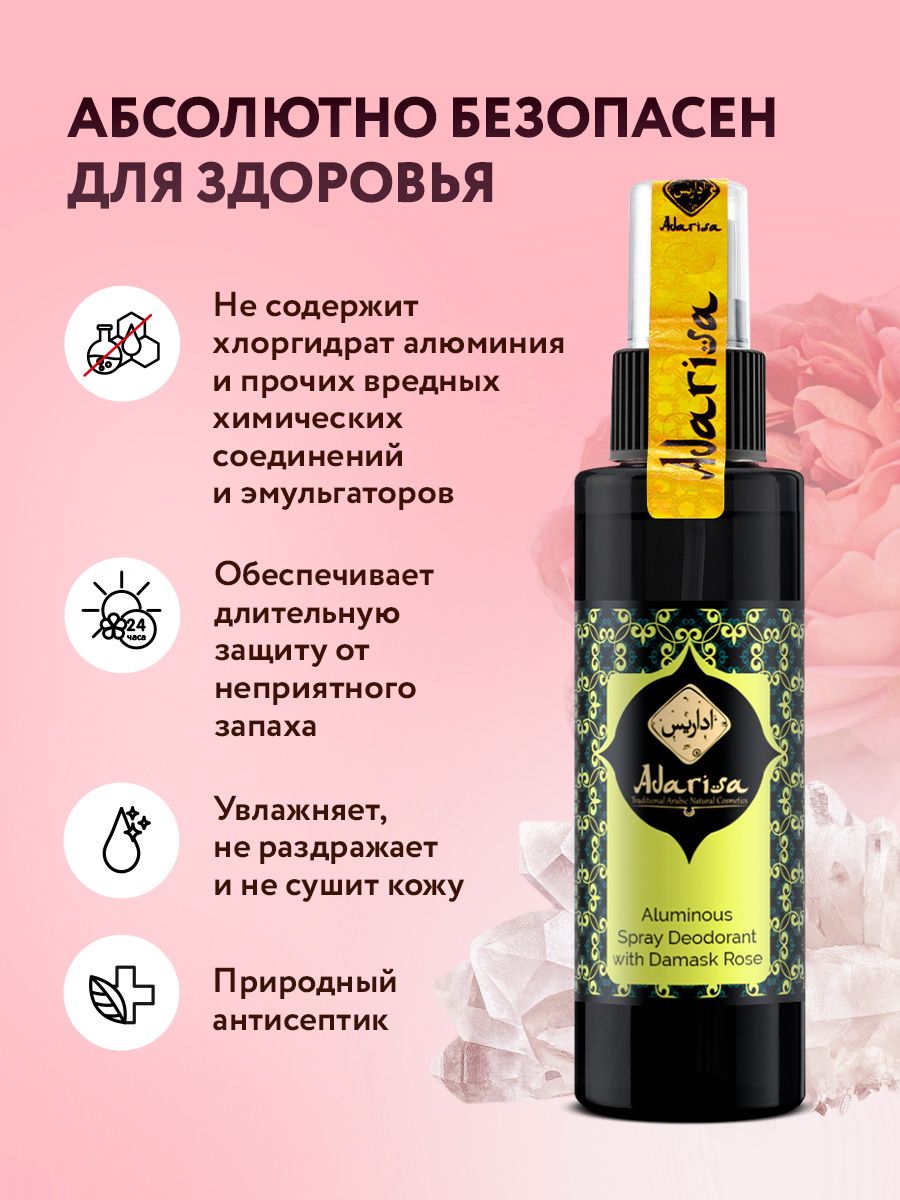 Описание: Квасцовый дезодорант спрей Adarisa с дамасской розой подарит вам ежедневное ощущение свежести и бережный уход за самыми деликатными участками кожи. Алюмокалиевые квасцы - экологически чистые кристаллы, регулирующие работу потовых желез и ликвидирующие бактерии - источник неприятного запаха. В сочетании со свойствами дамасской розы квасцы оказывают эффективную защиту от потоотделения и оздоравливают нежную кожу. Абсолют дамасской розы бережно увлажняют и смягчают кожу подмышек, продлевая ее молодость и красоту. Квасцовый дезодорант спрей не содержит алюминия, пропиленгликоля, парабенов и других токсичных веществ, не закрывает поры и не влияет негативным образом на работу потовых желез. Не образует следов и разводов на Вашей одежде/