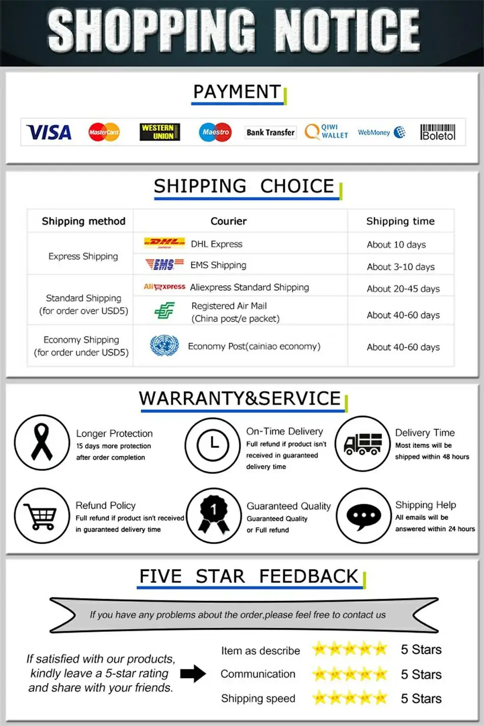 Пожалуйста, дайте нам 5-звездочный отзыв! Ваша оценка очень важна для нас. Это даст нам больше стимулов для предоставления более качественных продуктов. Большое вам спасибо!
