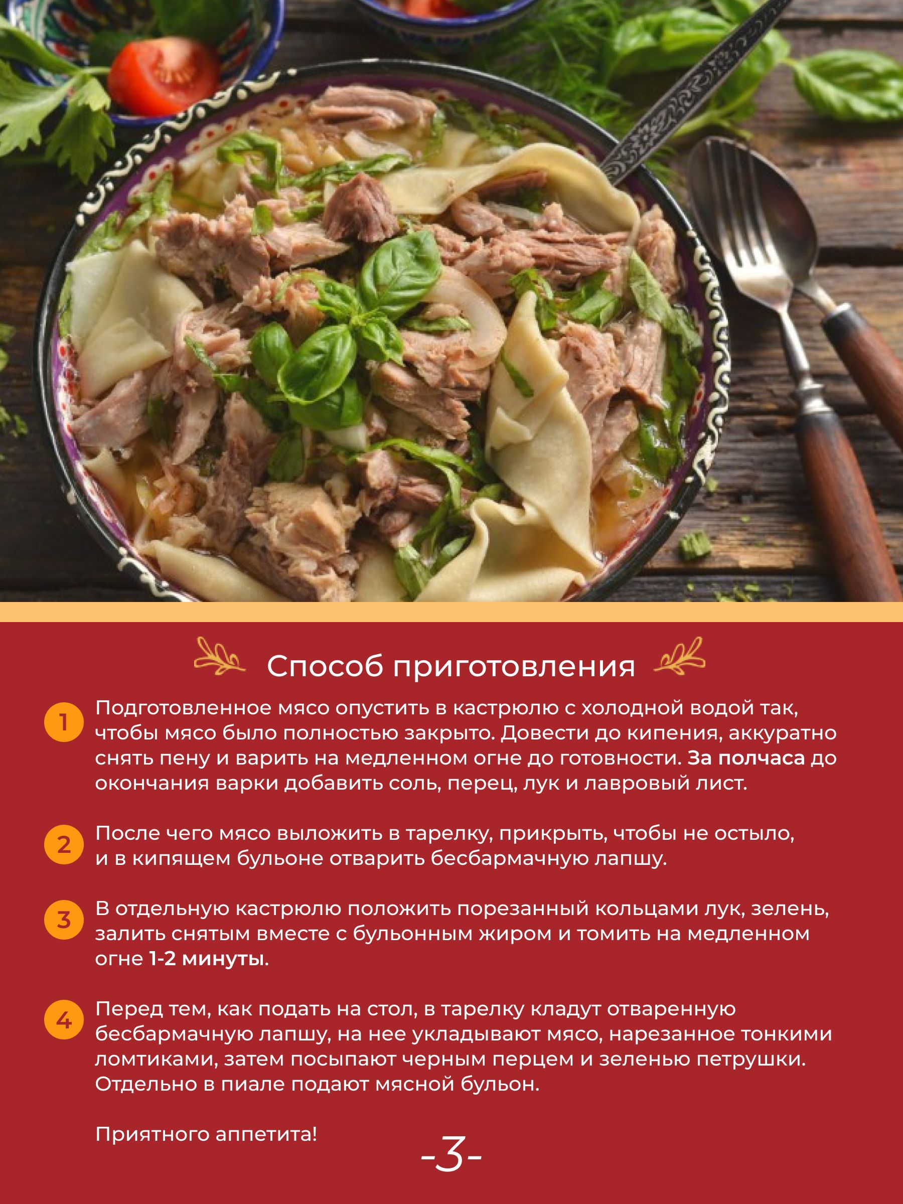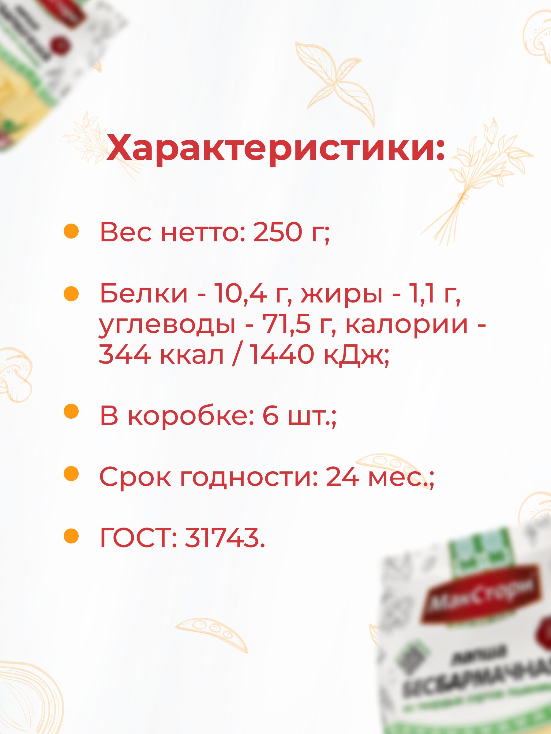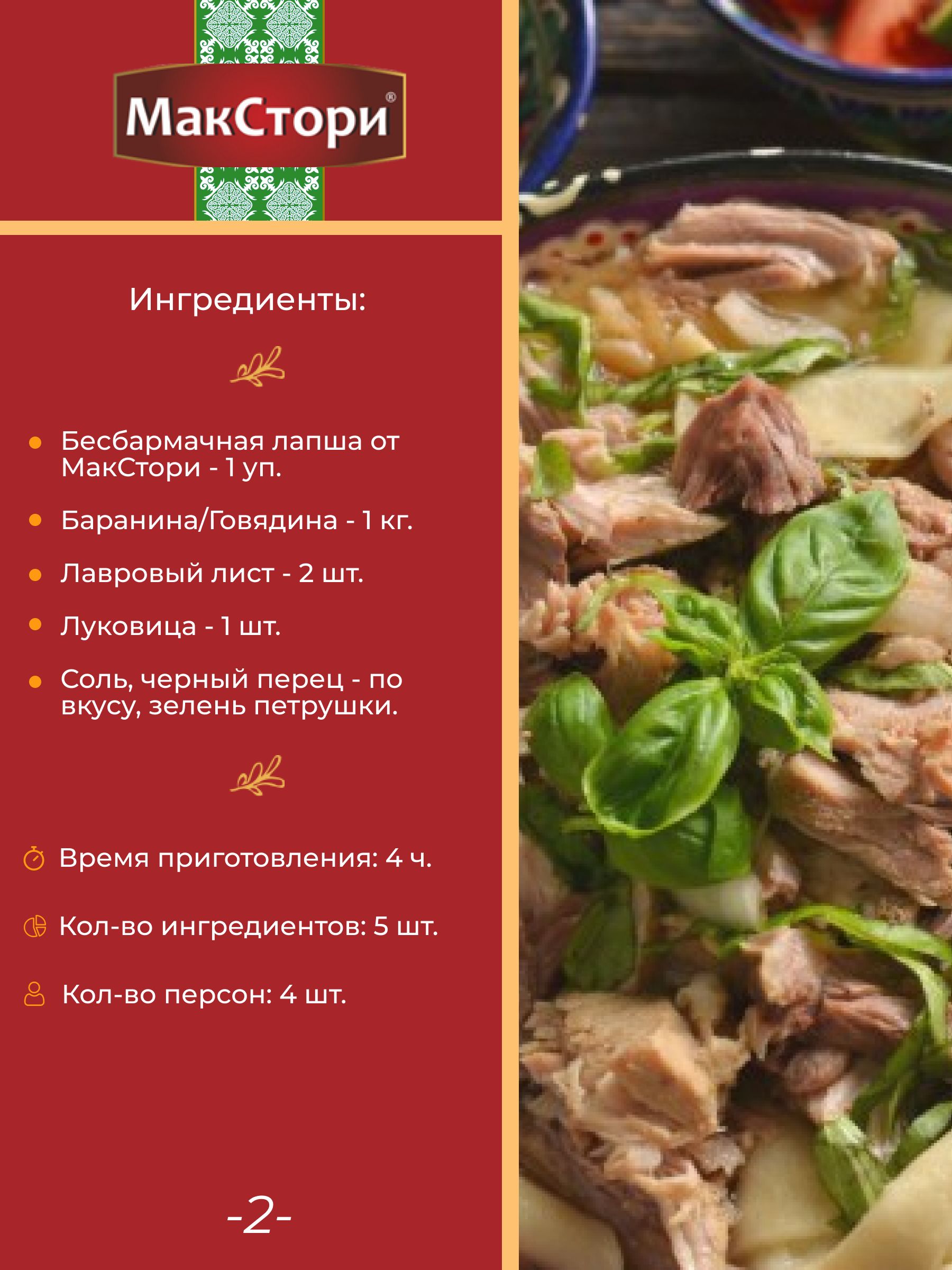 Описание: ЛАПША ДЛЯ БЕШБАРМАКАиз твердых сортов пшеницыБешбармак — национальное блюдо восточных странЭто макароны из твердых сортов пшеницы, отваренные в крепком мясном бульоне, которые подают с мясом, луком и зеленью. Такой продукт можно встретить в Казахстане, Киргизии, а в России регион, где любят бешбармак — Башкирия.В составе всего два ингредиента — мука и водаВ готовом виде макароны обладают нежной консистенцией, при этом имеют упругую структуру, яркий пшеничный вкус и аромат.Ручная раскаткаМакаронные изделия из твердых сортов пшеницы сделаны с воссозданием условий «ручной раскатки», а сушатся традиционным способом — на деревянных ситах в печи.Текст при отключенной в браузере загрузке изображенийТакие листы макарон также подойдут для лазаньи, запеканкиИз них можно свернуть небольшие рулетики или добавить как гарнир ко второму блюду.Лапша на любой вкус для ваших любимых блюд