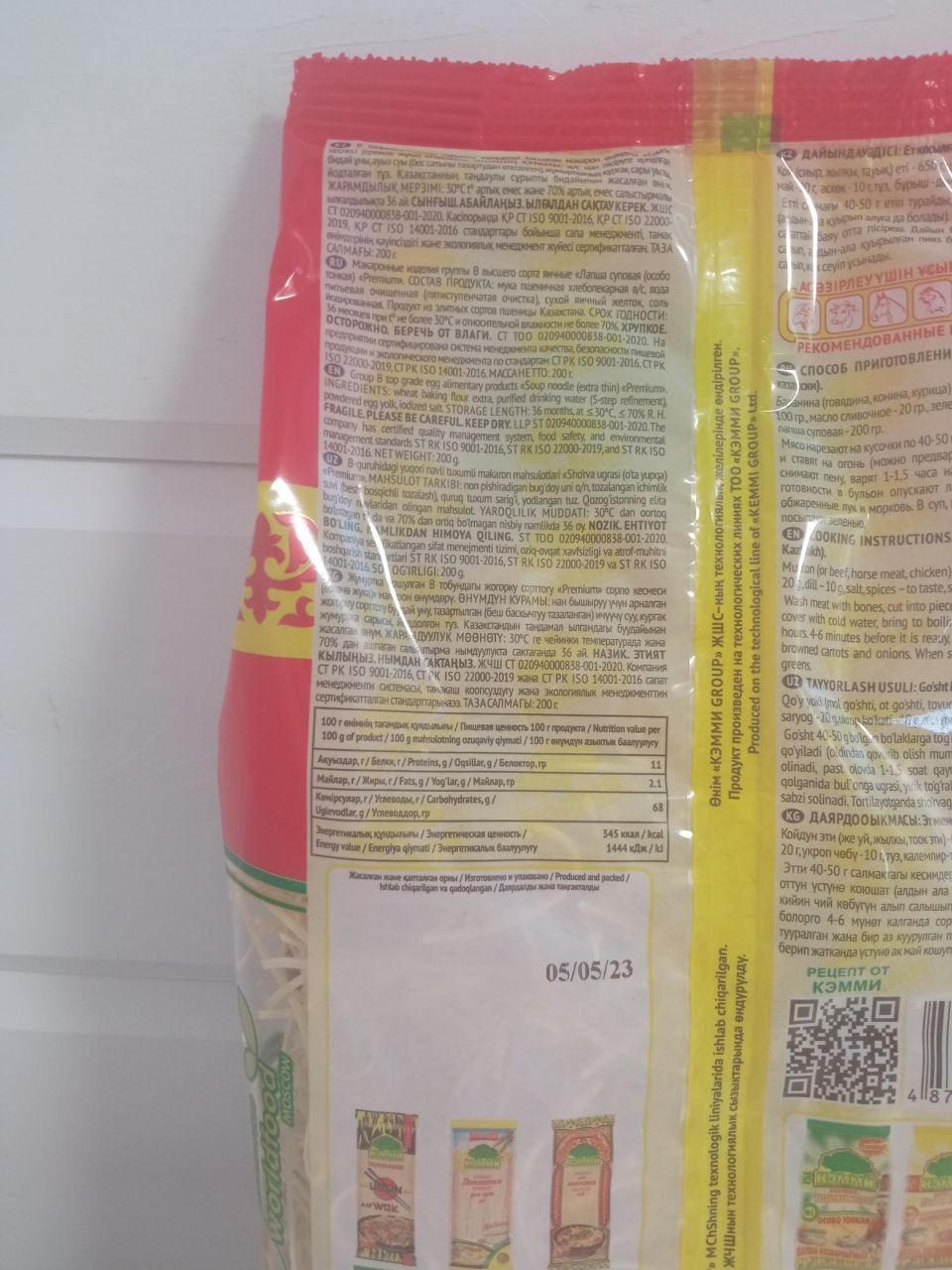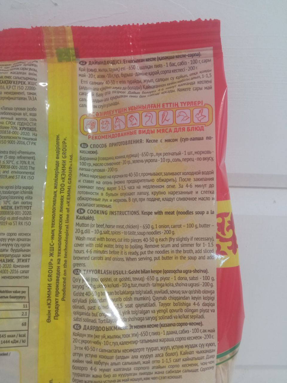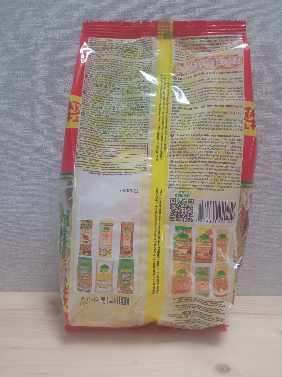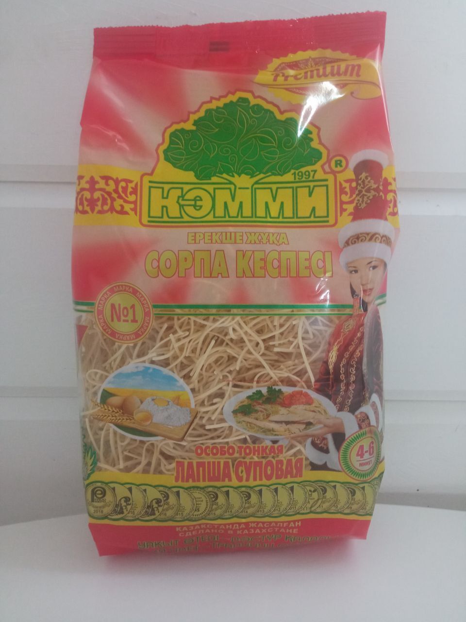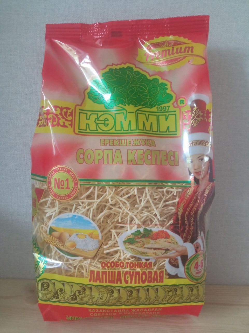 Описание: "Лапша домашняя" - полуфабрикат, используемый для приготовления супов из лапши, в том числе казахского национального блюда - "Кеспе". Ширина нарезки лапши чуть больше "суповой", что позволяет почувствовать вкус по-настоящему домашнего блюда.