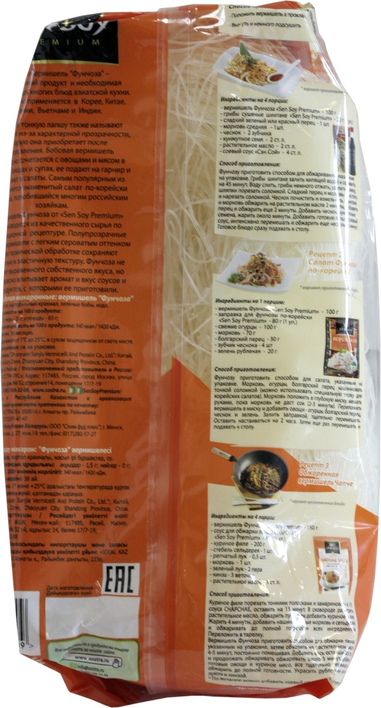 Описание: Бобовая вермишель "Фунчоза" – экзотический гарнир к восточным деликатесам и необходимая составляющая многих блюд азиатской кухни. Она сохраняет все ценные свойства зеленых бобов, но гораздо более удобна и универсальна в использовании, чем цельные бобы. Прозрачная, словно стеклянная, эластичная бобовая вермишель обладает нежной консистенцией и нейтральным вкусом, поэтому на ее основе готовится множество разнообразных блюд – вегетарианских и мясных, с морепродуктами и всевозможными соусами из овощей, фруктов, пряных трав и восточных специй. Такую вермишель часто добавляют в супы и бульоны, подают на гарнир и добавляют в салаты. Самым популярным из них является салат с тем же названием – фунчоза. В его состав входят особенно пикантные восточные специи и свежие овощи. Такой салат украсит любой стол – как будничный, так и самый праздничный.