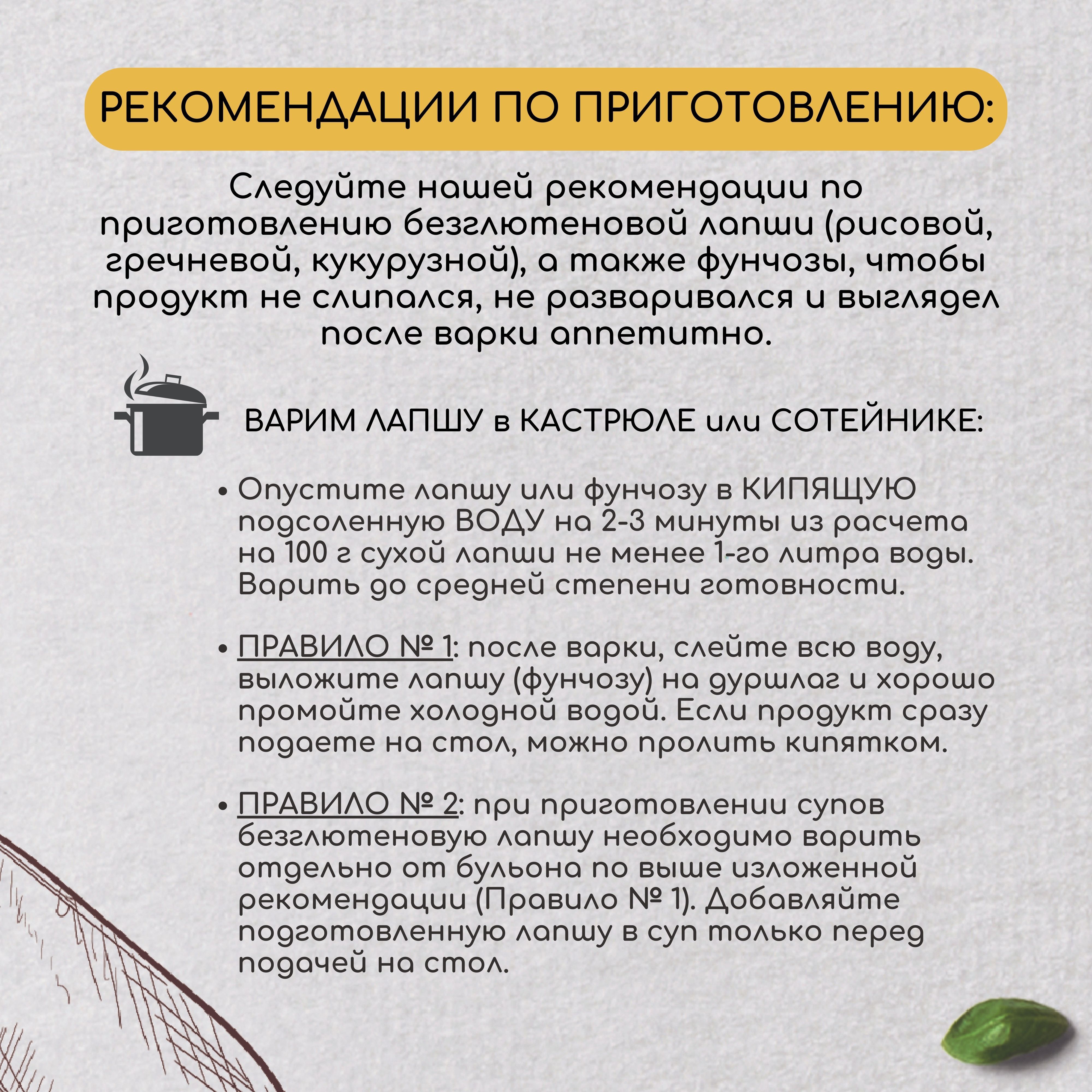 • Правило № 2: при приготовлении супов лапшу необходимо варить отдельно от бульона по вышеизложенной рекомендации (Правило № 1). Добавляйте подготовленную лапшу в суп только перед подачей на стол.