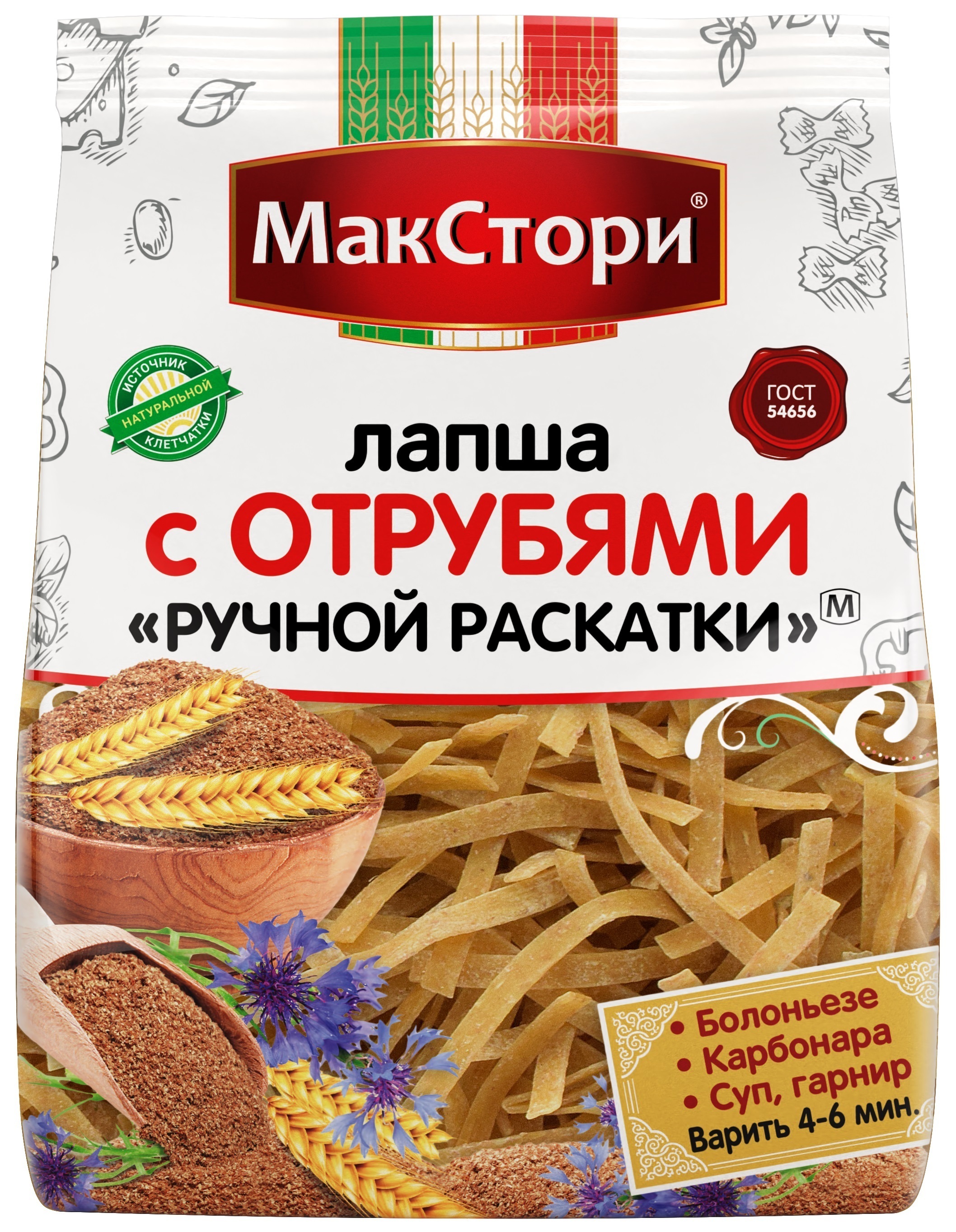 Время варки лапши —  6 минут. Макароны из твердых сортов пшеницы надолго насыщают, так как являются источником долгих углеводов. Отруби в составе — это  клетчатка, полезная для сердечно-сосудистой системы и ЖКТ.