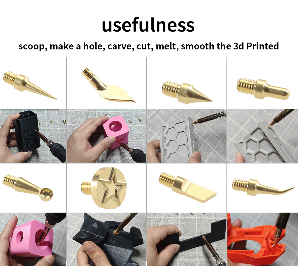 2. Сфера применения: взаимозаменяема со стандартными жала паяльника общего назначения 936, используемыми для M2 (M2, 5 общий), M3, M4, M5, M6 (1/4 "), m8 и другие гайки или вставки горячего расплава, часто используемые в 3D-принтере, печатают гайки из меди горячего расплава или гайки имплантатов на пластике.