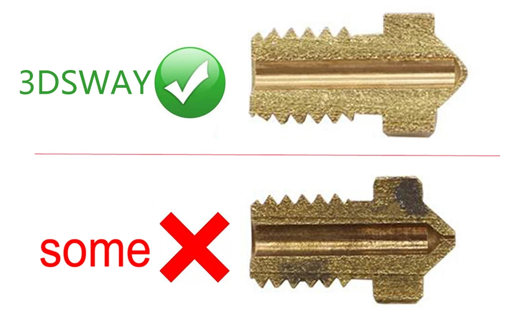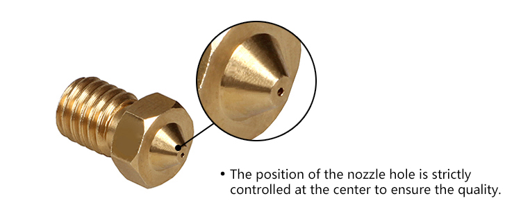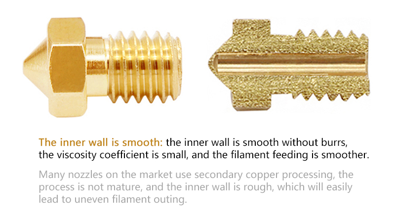 The inner wall is smooth: the inner wall is smooth without burrs, the viscosity coefficient is small, and the filament feeding is smoother. Many nozzles on the market use secondary copper processing, the process is not mature, and the inner wall is rough, which will easily lead to uneven filament outing.