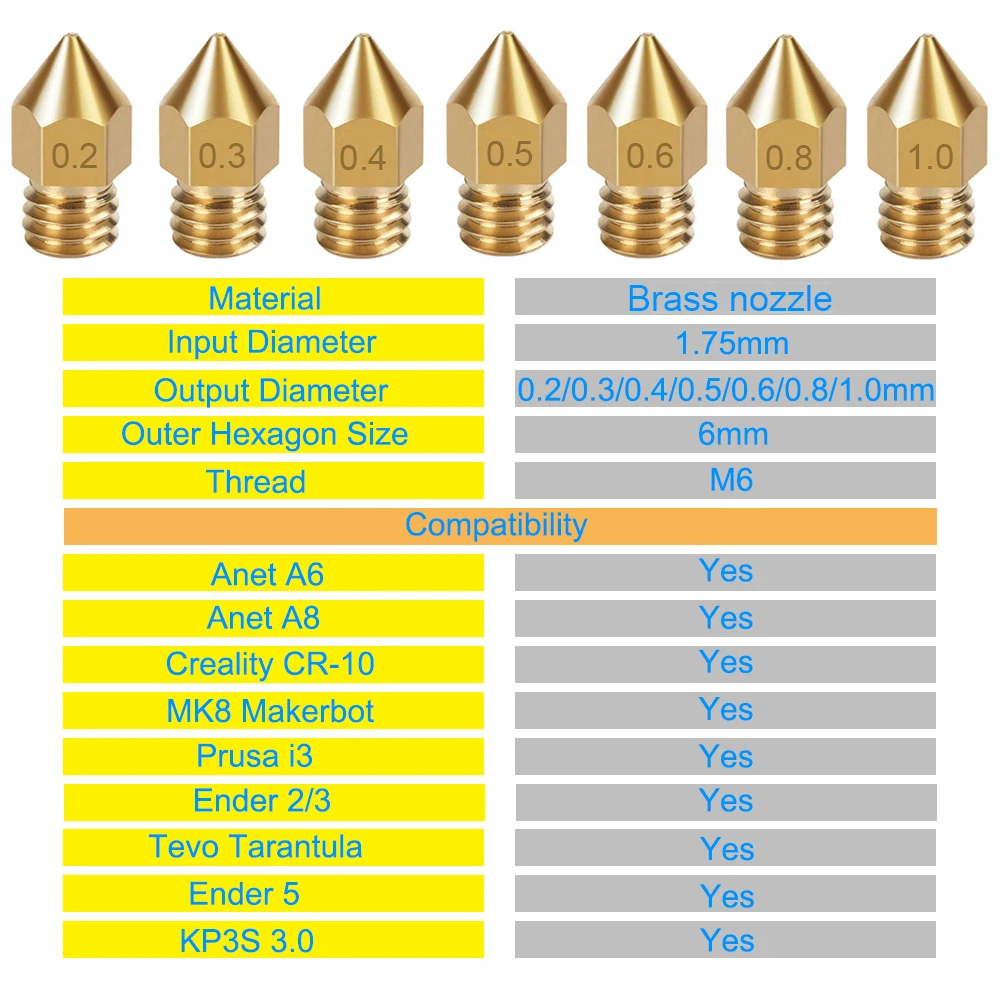 5 шт. насадок премиум класса MK8 0,2 0,3 0,4 0,5 0,6 0,8 1,0 мм латунная Резьба M6 1,75 мм нить для CR-10 Ender 3 Prusa i3 KP3S Mega