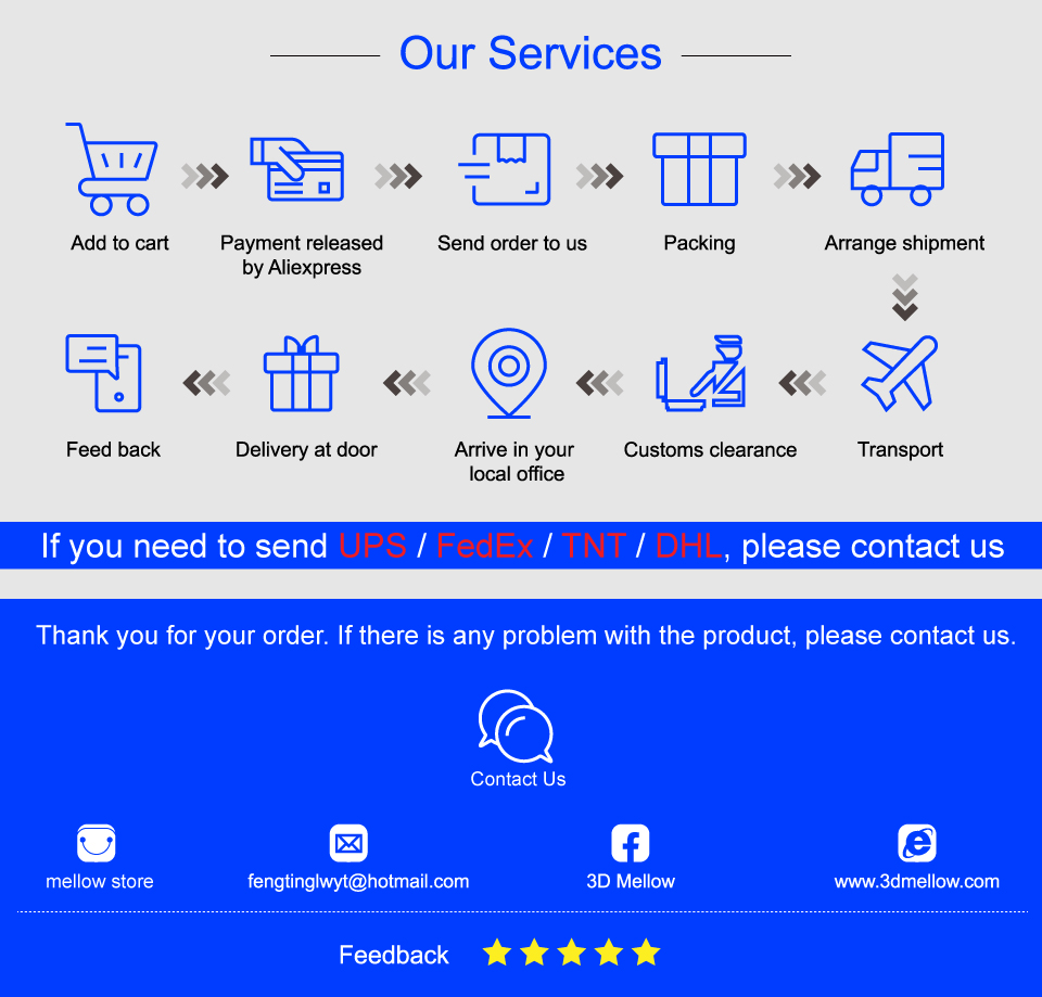 Thank you for coming to our shop. We are committed to developing 3D printer accessories that can be used on all 3D printers. We have 3 main product lines: NF Extruders, NF Hotends and FLY Motherboards and Electronics. We hope our products will bring you a better overall user experience. If you have any ideas (products, use, sales), please contact us. We look forward to hearing from you.