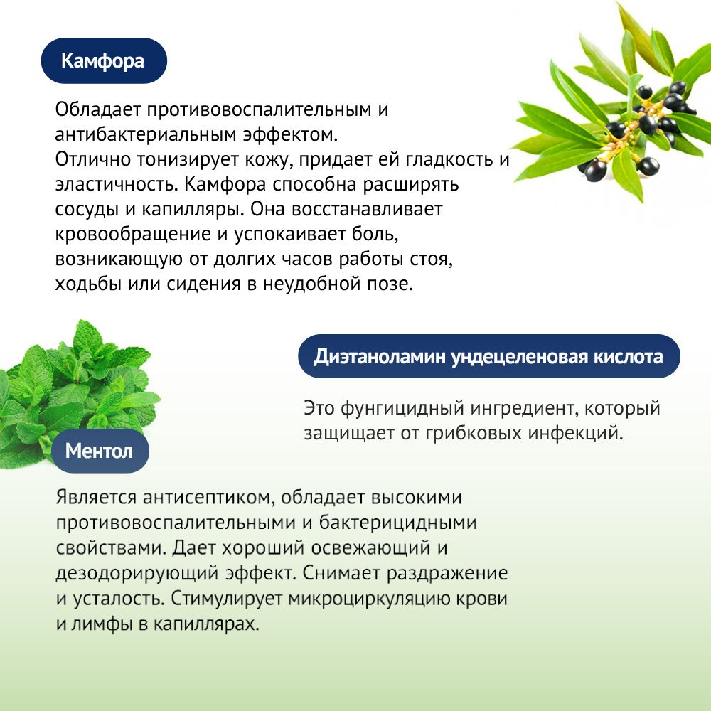 • Ментол является антисептиком, обладает высокими противовоспалительными и бактерицидными свойствами. Дает хороший освежающий и дезодорирующий эффект. Снимает раздражение и усталость. Стимулирует микроциркуляцию крови и лимфы в капиллярах. Охлаждающее действие быстро возвращает «горящей» коже ног хорошее самочувствие.