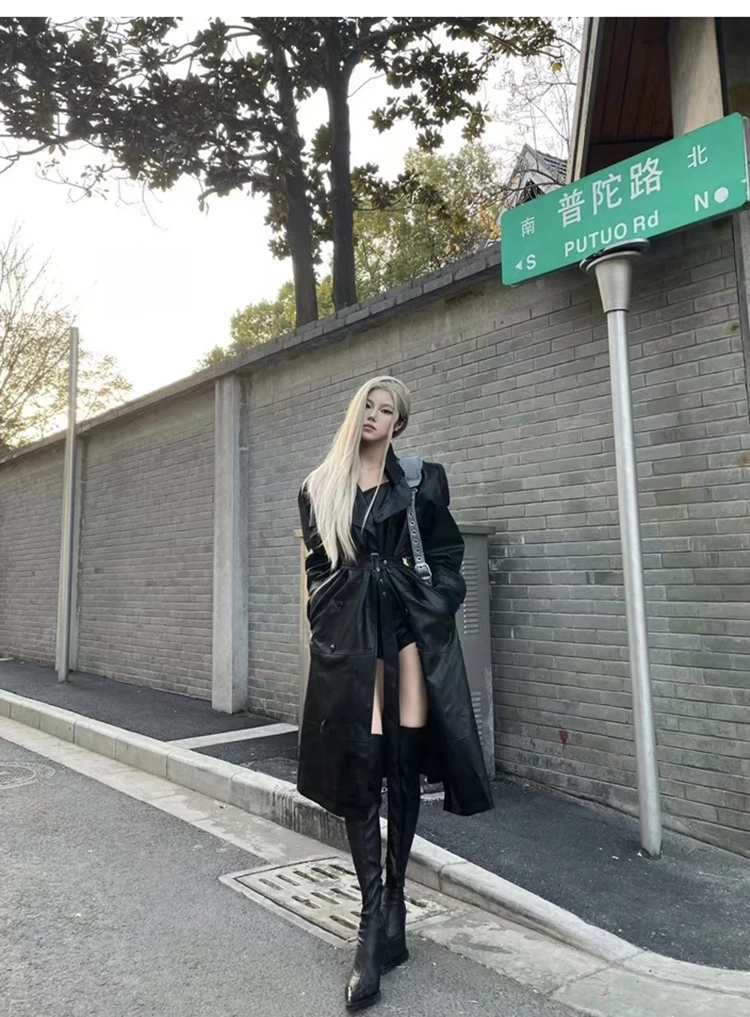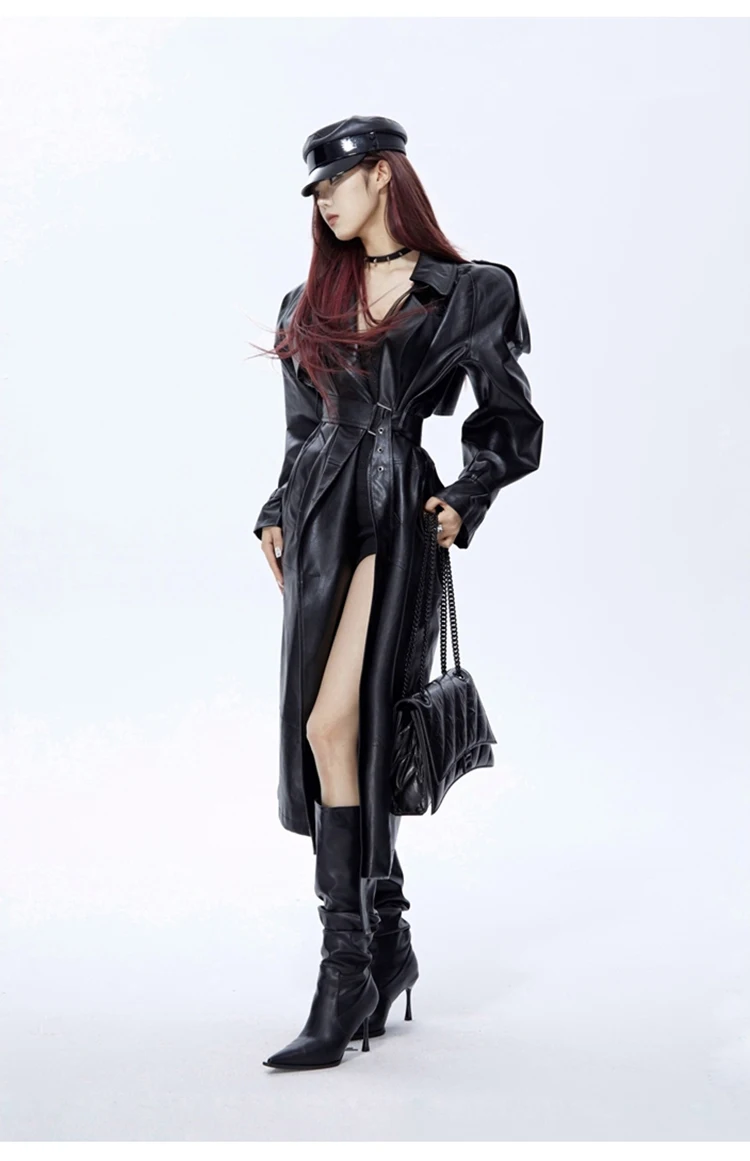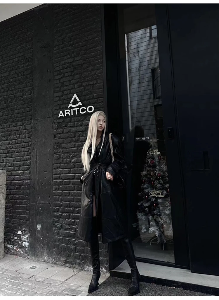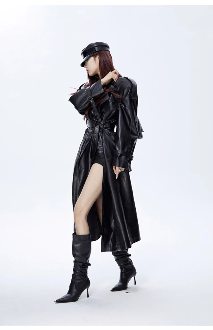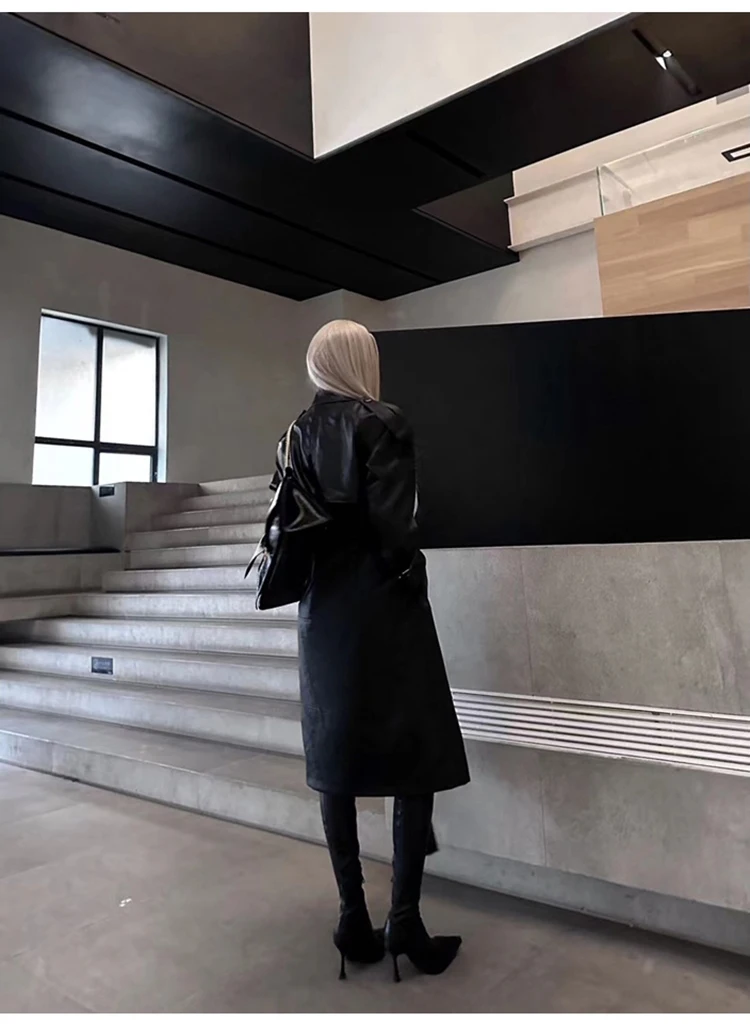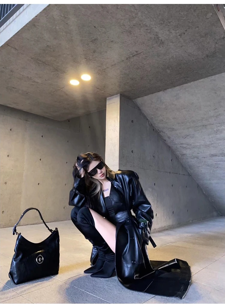 Lautaro Весенняя осень Оверсайз Длинный Черный Pu Кожаный Тренч для женщин с наплечниками с поясом с длинным рукавом Подиум Европейская мода 2023 кожаный плащ женский кожаное пальто женское тренч из экокожи