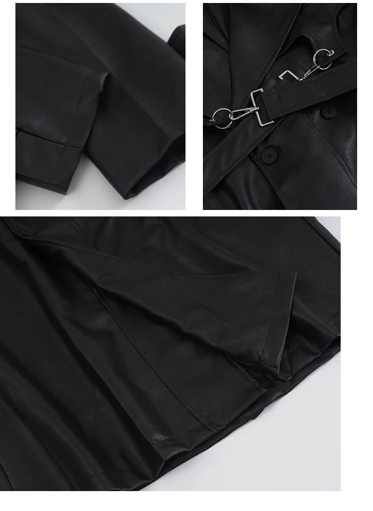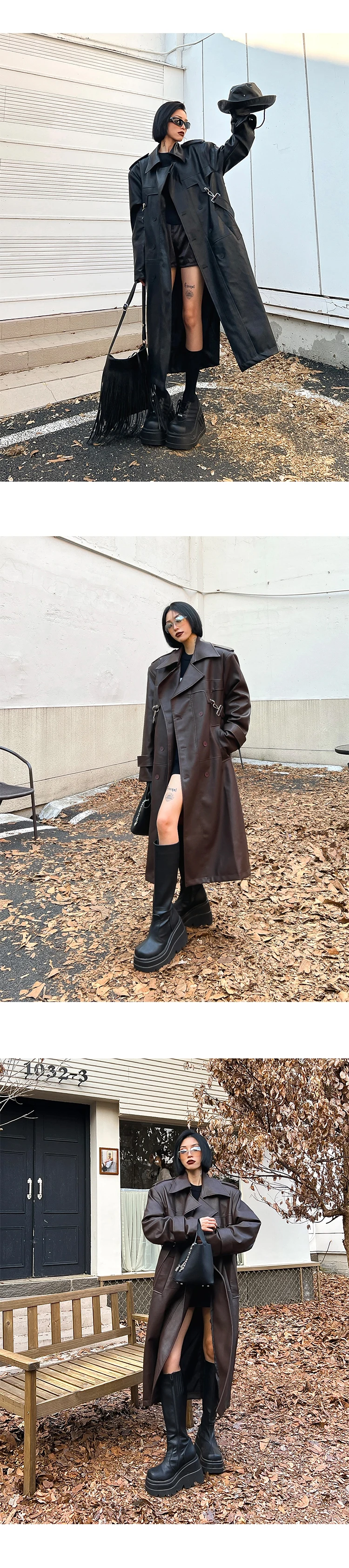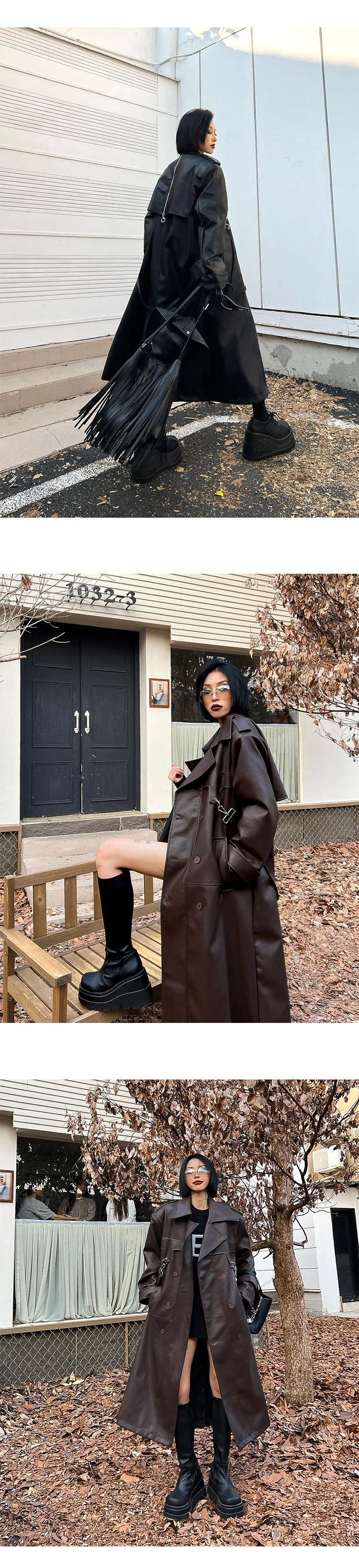 Lautaro Весна Осень Длинная Оверсайз Черный Коричневый Искусственный Кожа Тренч Для Женщин Двубортный Свободный Роскошный Дизайнер Верхняя одежда женщины 2023 Кожаное пальто Женщины плащ кожаный женский