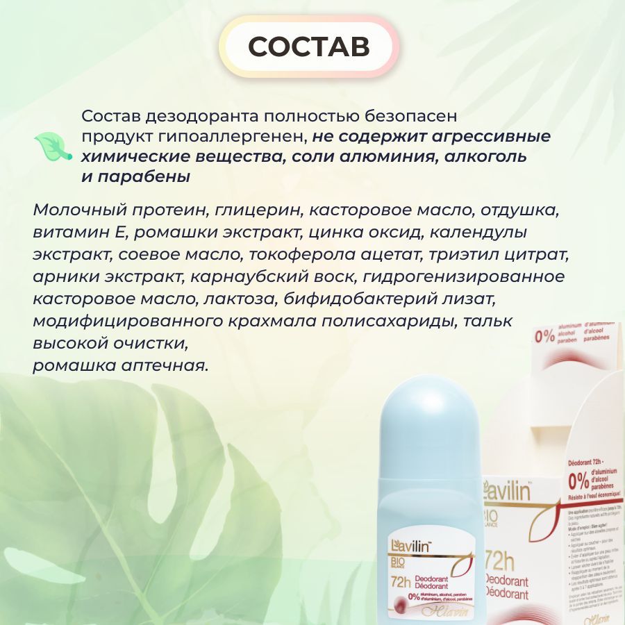 Описание: Бестселлер линейки дезодорантов Лавилин (ранее Хлавин) - дезодорант 72 часа lavilin в удобном шариковом формате - экологически чистый продукт: не содержит соли алюминия, алкоголь и парабены. При этом лавилин дезодорант израиль эффективно нейтрализует запах пота в течение 72 часов, не оставляет следов на одежде и не вызывает аллергии. дезодорант lavilin обладает приятным нейтральным запахом и подойдет как для женщин, так и для мужчин и подростков.