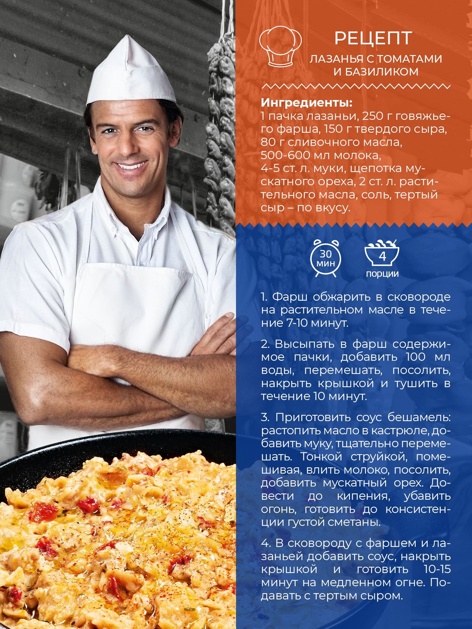 Процесс приготовления невероятно простой и быстрый. Достаточно потушить, содержимое пачки с обжаренным на сковороде фаршем, а затем добавить соус бешамель. Для приготовления соуса бешамель в кастрюле следует растопить 80 г сливочного масла, добавить 4 ст. л. муки и тщательно перемешать. После этого в полученную массу тонкой струей влить 500 мл молока, добавить соль и небольшое количество мускатного ореха. Соус довести до кипения и на медленном огне готовить до тех пор, пока он не приобретет консистенцию густой сметаны. Дополнительно лазанью можно еще и запечь в духовке, после чего в полной мере можно наслаждаться неповторимым колоритом Неаполя. Подавать готовое блюдо рекомендуется с тертым сыром. Готовка займет всего 35 минут, а в итоге получится восхитительное блюдо, которое не сможет оставить равнодушными даже самых требовательных гурманов. Оно подходит для приверженцев здорового, правильного питания. Для вегетарианцев и веганов нашу лазанью можно приготовить и без мяса, используя вместо фарша грибы или кабачки. Ароматная лазанья с измельченной овощной смесью, растительными компонентами и пряностями станет отличной альтернативой привычным гарнирам. Блюдо идеально сочетается с вином. Смесь для приготовления лазаньи - это 100% натуральный продукт, который не содержит ГМО и соли. Она подходит как для любителей мясных блюд, так и для веганов и вегетарианцев. Лазанья от бренда Yelli - отличная идея для подарка. Такой презент непременно порадует близких.