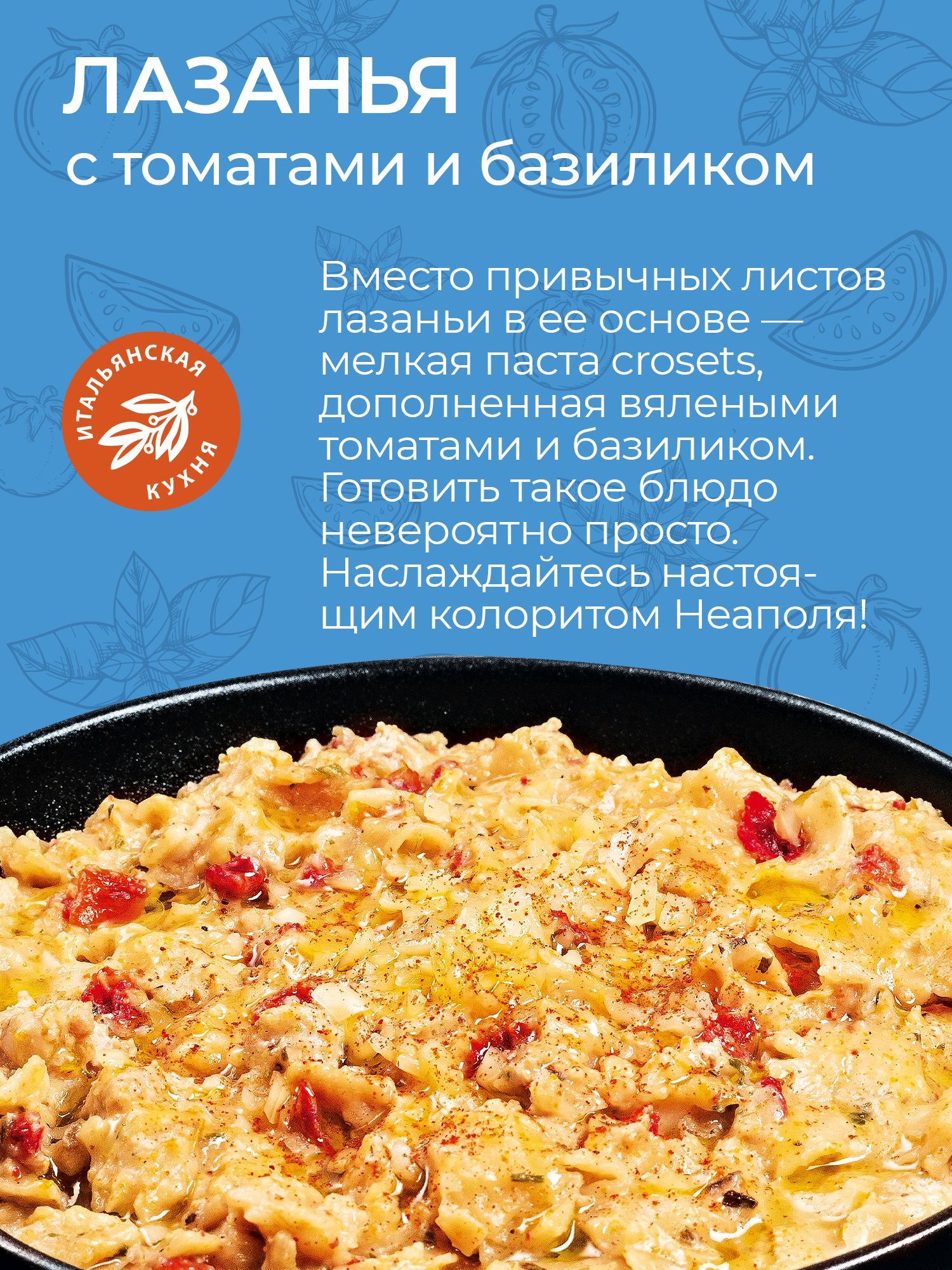 Описание: Лазанья от бренда Yelli непременно понравится истинным ценителям итальянской кухни и любителям экспериментов. Это новая, современная версия традиционного неаполитанского рецепта. Вместо обычных листов лазаньи в качестве основы используется мелкая паста сrosets из твердых сортов пшеницы, которая изысканно сочетается с вялеными томатами, базиликом и идеально подобранным букетом специй и трав.
