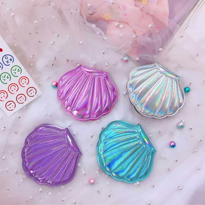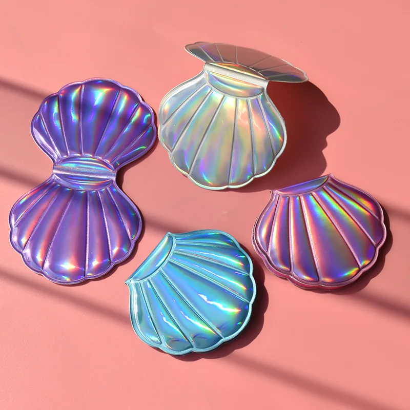 Лазерное зеркало для макияжа с блестками в виде ракушки, 2 шт., портативное милое двухстороннее складное карманное зеркало, инструмент для красоты