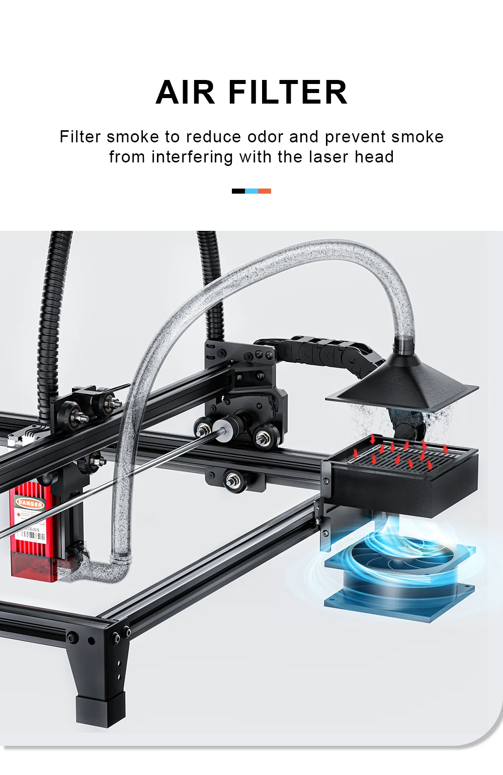 2. Устройство фильтрации воздуха: Он может поглощать и фильтровать дым во время процесса гравировки, чтобы поддерживать чистоту в помещении, повышая точность гравировки и уменьшая помехи дыма от лазера.