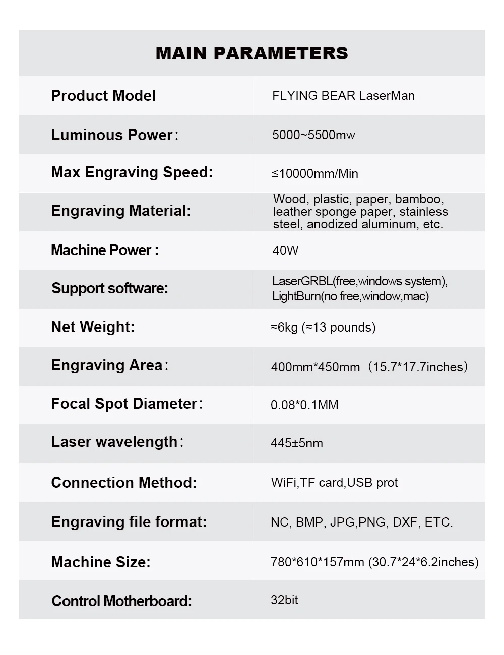 <span class="SnowProductCharacteristics_SnowProductCharacteristicsItem__titleContent__534v9">Support software</span> LaserGRBL(free,windows system),LightBurn(no free,window,mac)