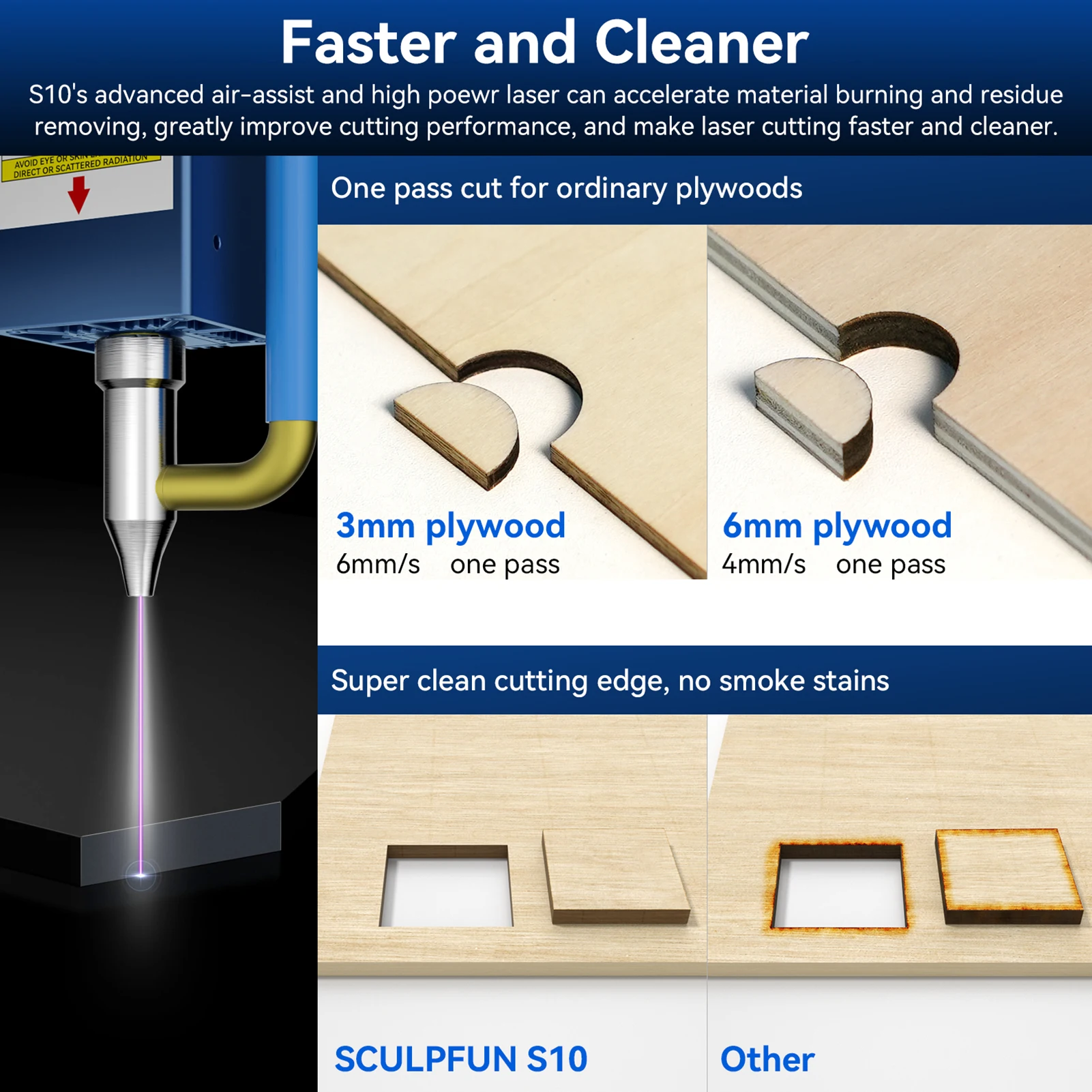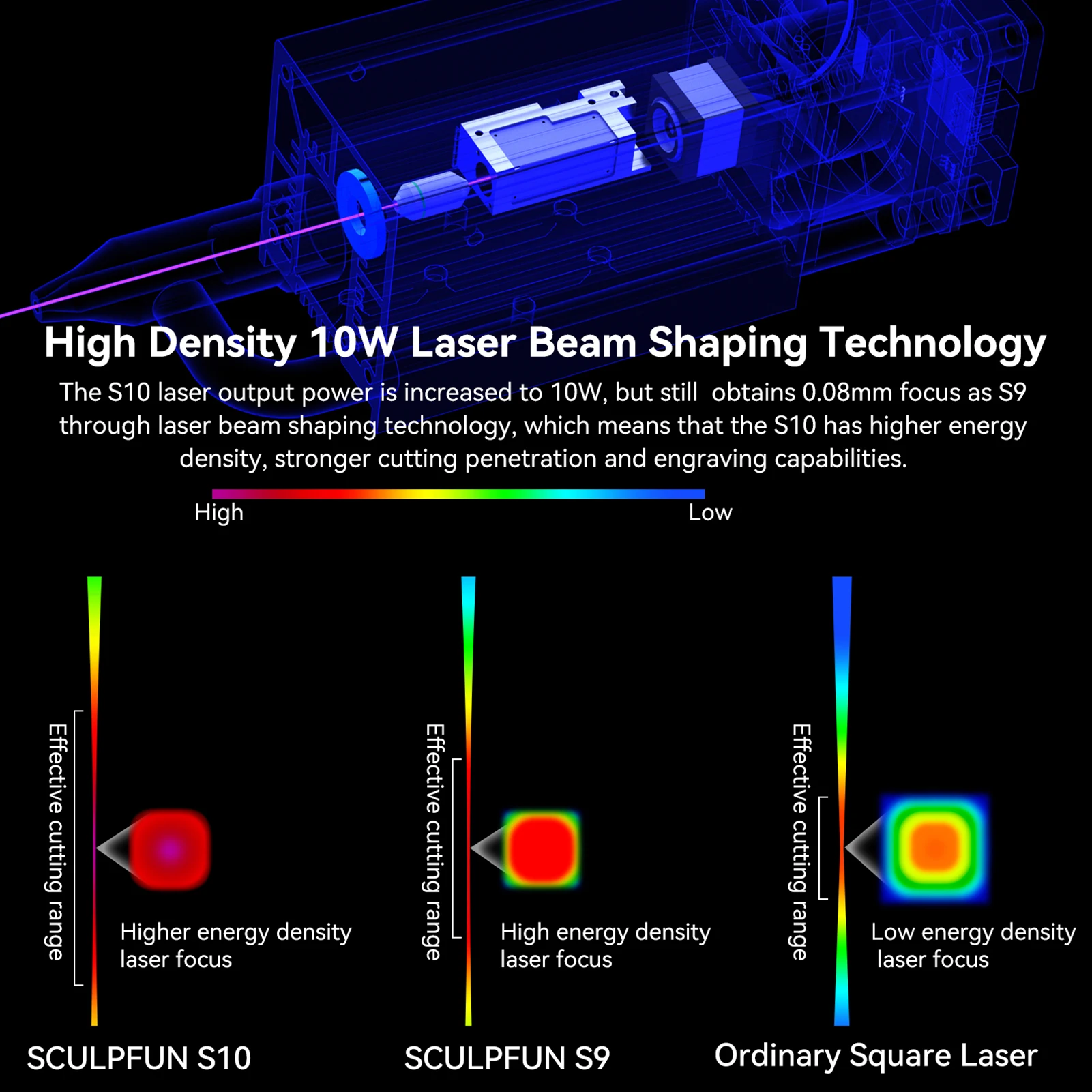 Технология формирования лазерного луча 10 Вт:Выходная мощность лазера S10 увеличена до 10 Вт, что вдвое больше, чем у S9. Но S10 получает тот же ультратонкий лазерный луч с фокусом 0,08 мм, что и S9, что означает, что S10 имеет более высокую плотность энергии, более сильное проникновение резания и возможности гравировки.