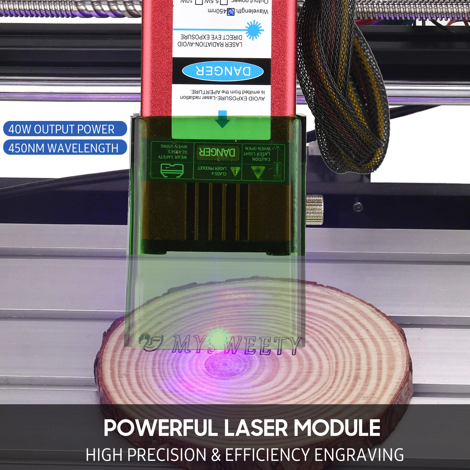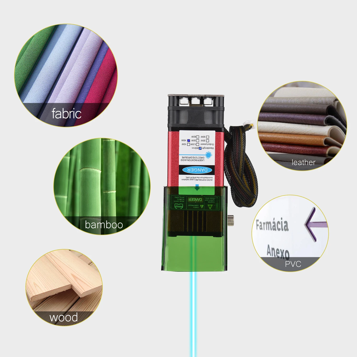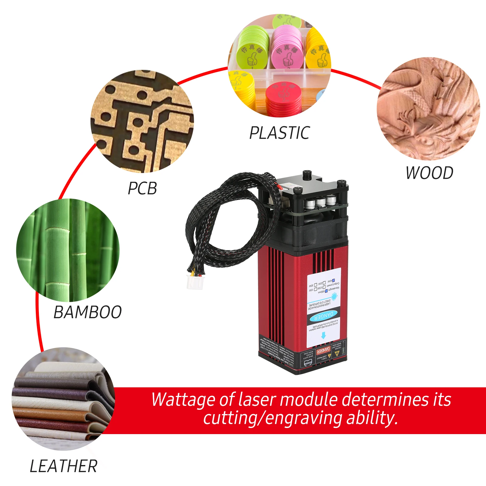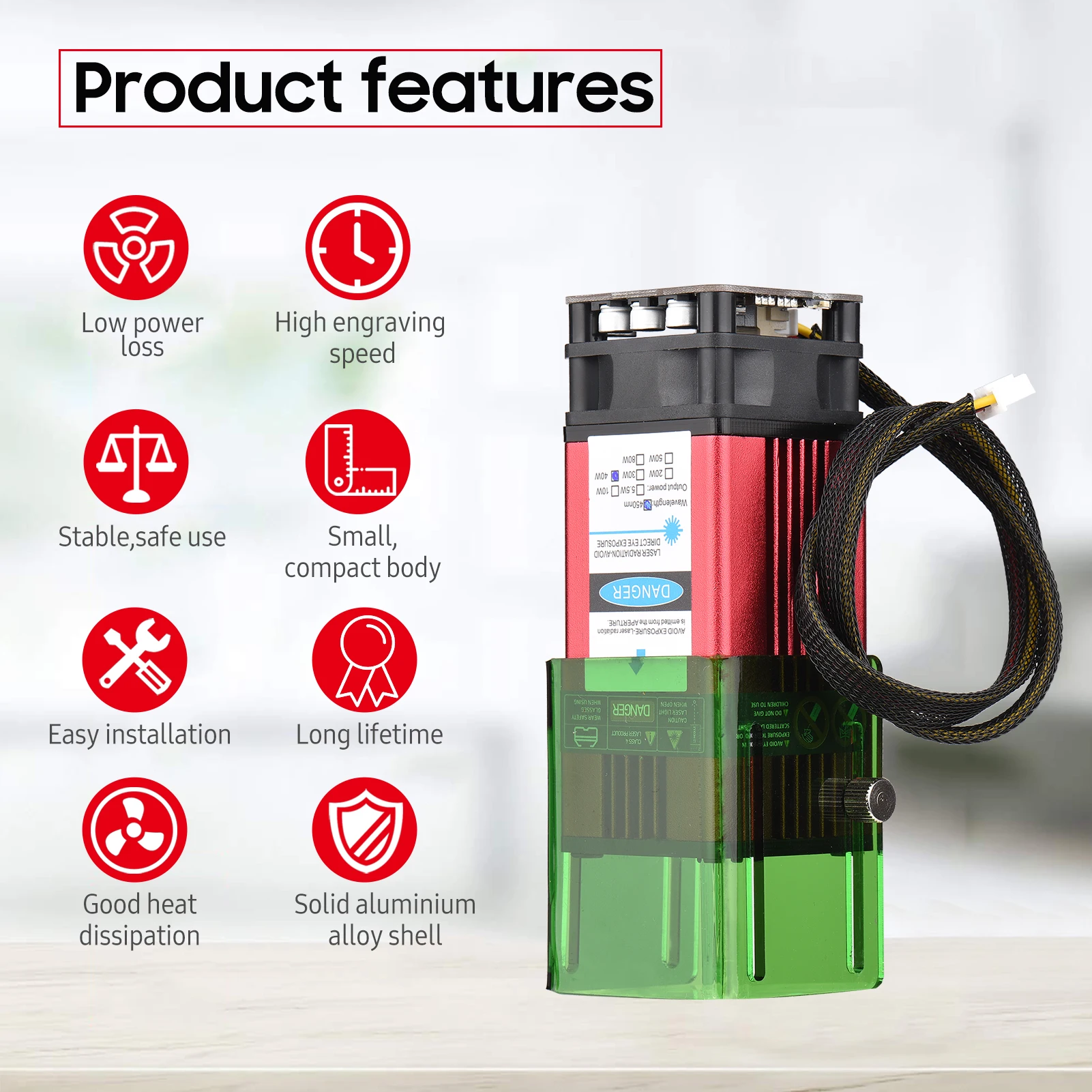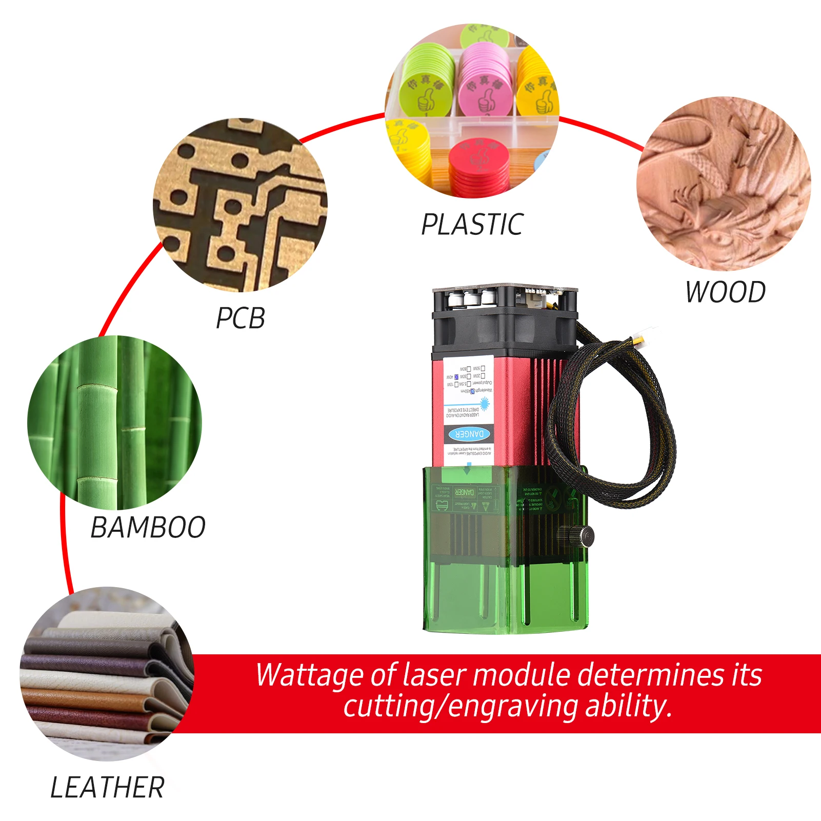 Профессиональный лазерный модуль, простой в установке, с более низкой потерей, обеспечивает длину волны 450нм, для эффективной, точной гравировки и резки пластика, дерева, кожи, бумаги и так далее, подходит для широкого спектра гравировальных машин.