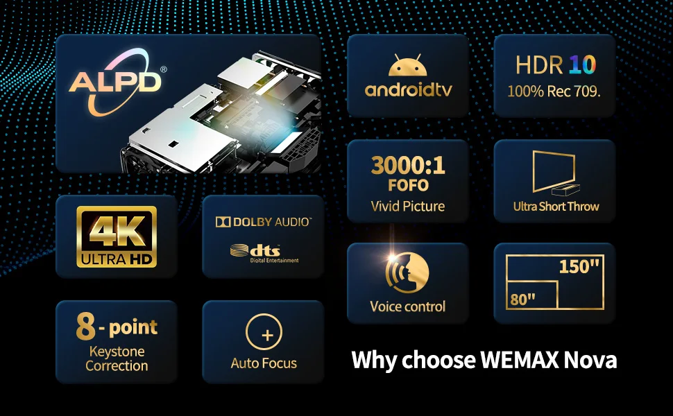 • <МАКС. 150-ДЮЙМОВЫЙ РАЗМЕР ЭКРАНА ПРОЕКТОРА>: С лазерным проектором WeMax Nova вы можете выбрать один из четырех разных размеров проектора. Массивный экран размером до 150 дюймов станет центральным элементом вашего домашнего кинотеатра. Выберите правильный размер для вашей настройки, начиная с 80 дюймов, 100 дюймов, 120 дюймов и 150 дюймов для проецирования. 8-точечные циферблаты коррекции трапецеидальных искажений меняют качество изображения, внося микрокорректировки для идеального домашнего кинотеатра.