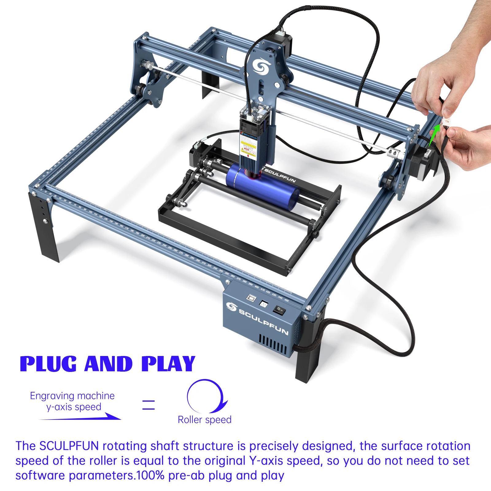 Как использовать: выньте оригинальный кабель двигателя по оси Y лазерного гравировального станка, вставьте его в роторный ролик SCULPFUN, и вы можете начать его использовать. Нет необходимости устанавливать параметр в программном обеспечении, потому что линейная скорость поверхности ролика такая же, как исходная скорость оси Y.