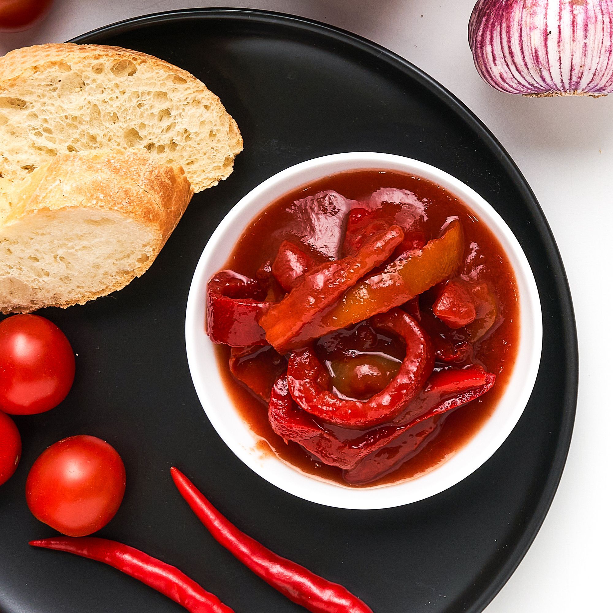 перец болгарский сладкий, томатная паста, сахар, соль пищевая поваренная, регулятор кислотности-лимонная кислота, перец черный горошек.