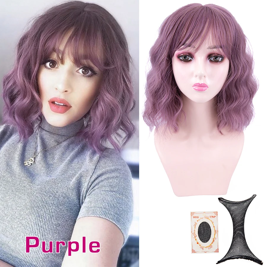 Short Wavy Wigs for Women Pink Hair Purple Wigs with Bangs