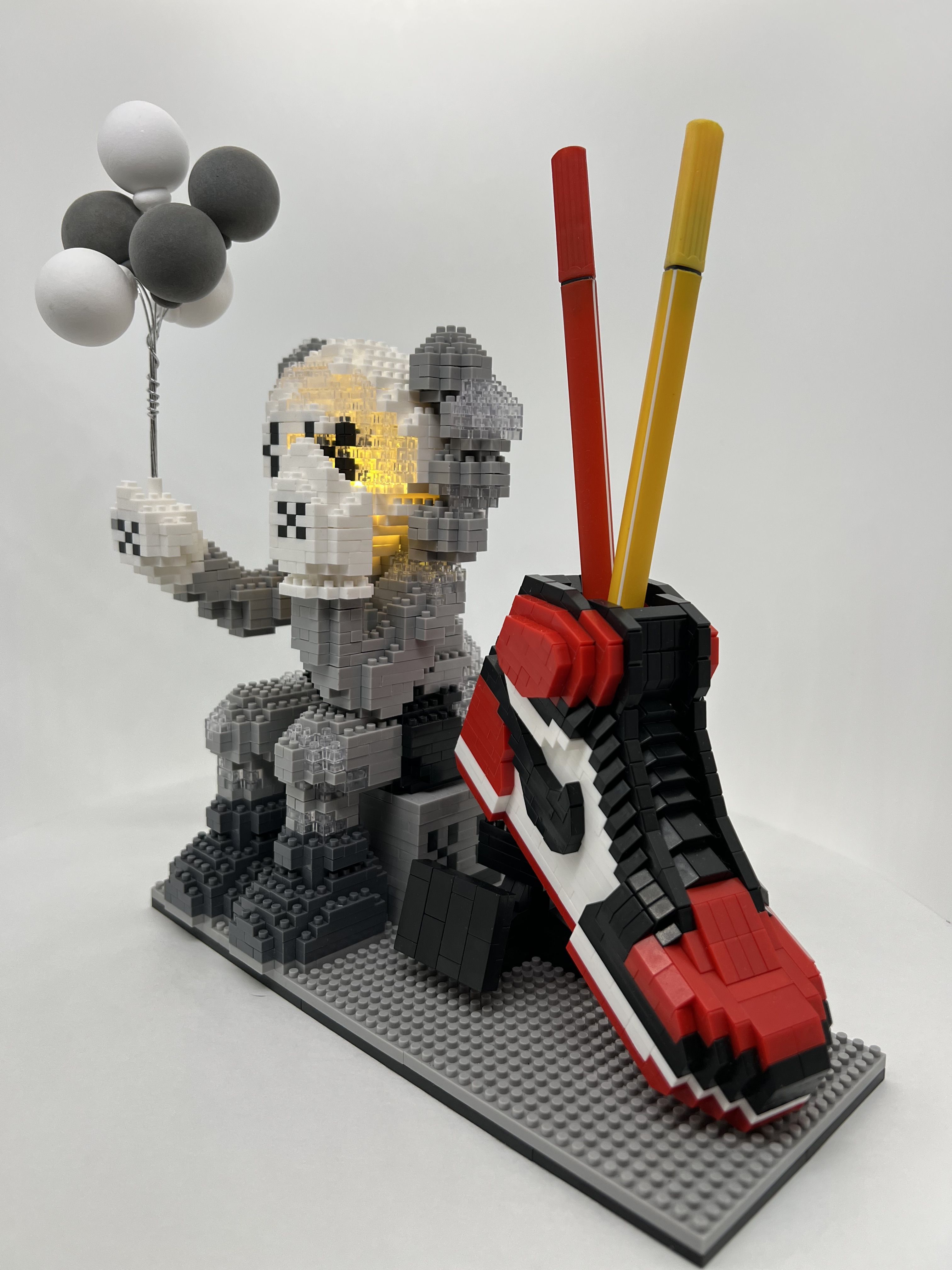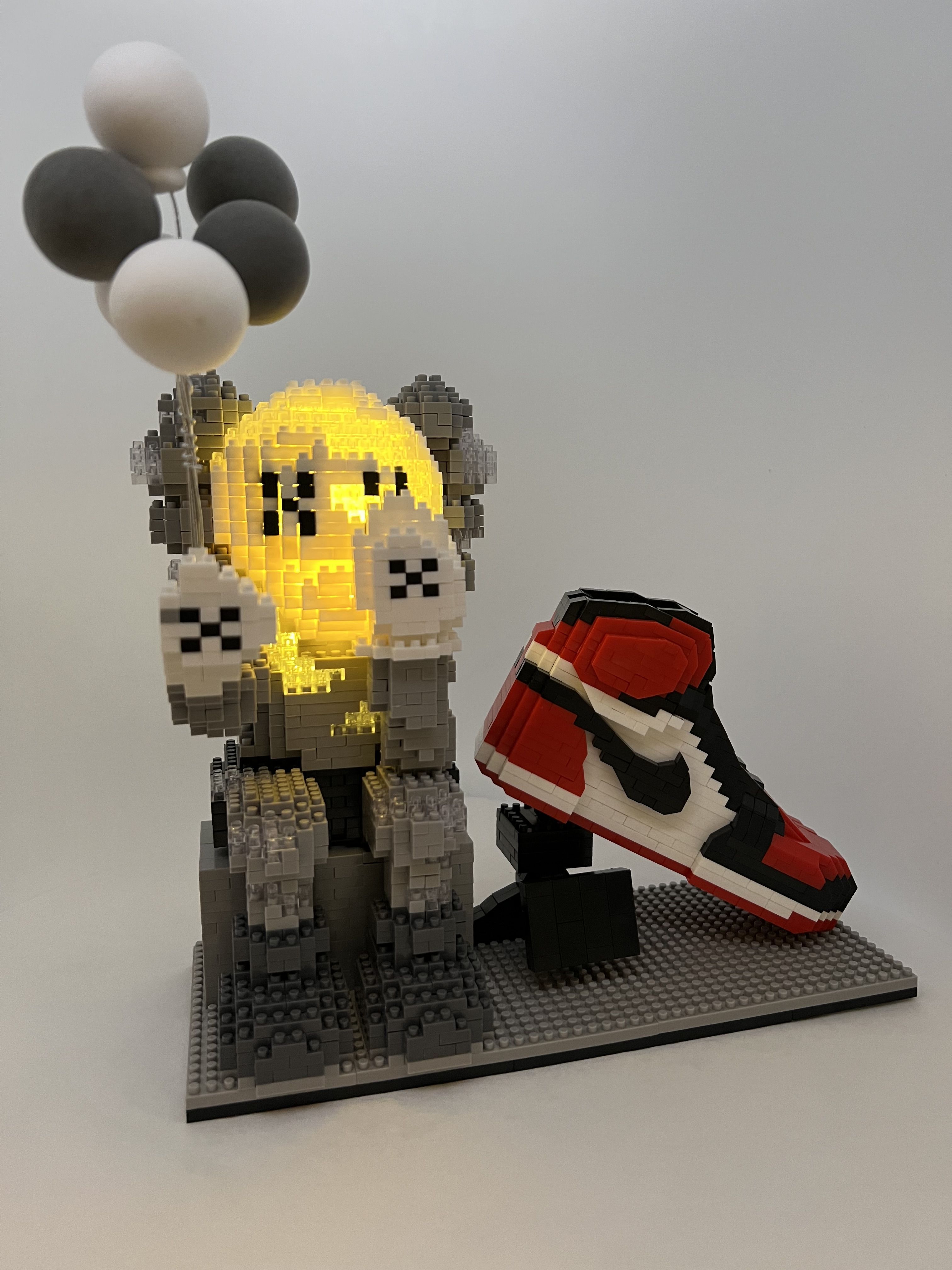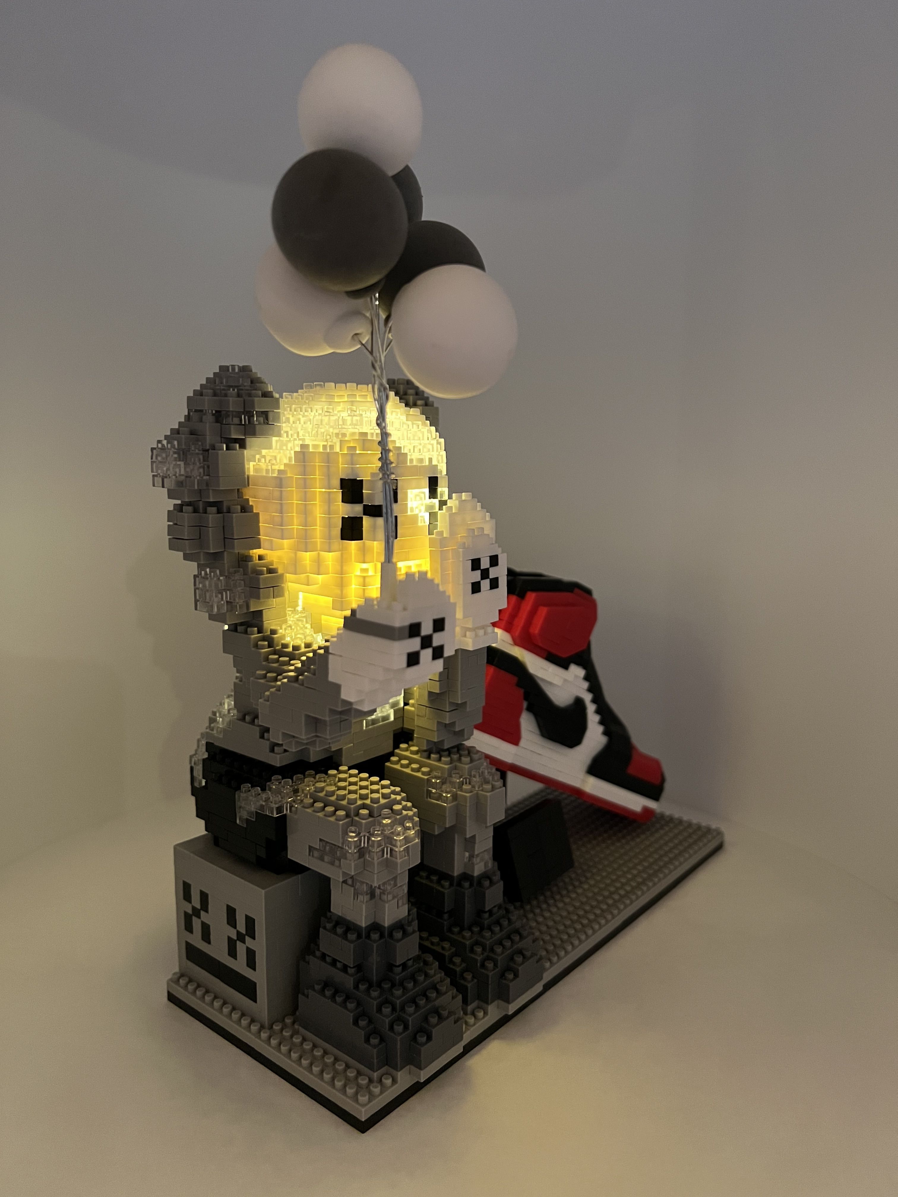 В составе конструктора детали из безопасного пластика, светодиодная нить, воздушные шарики которые держит Kaws.Так же в наборе идет подробная схема сборки,батарейки.
