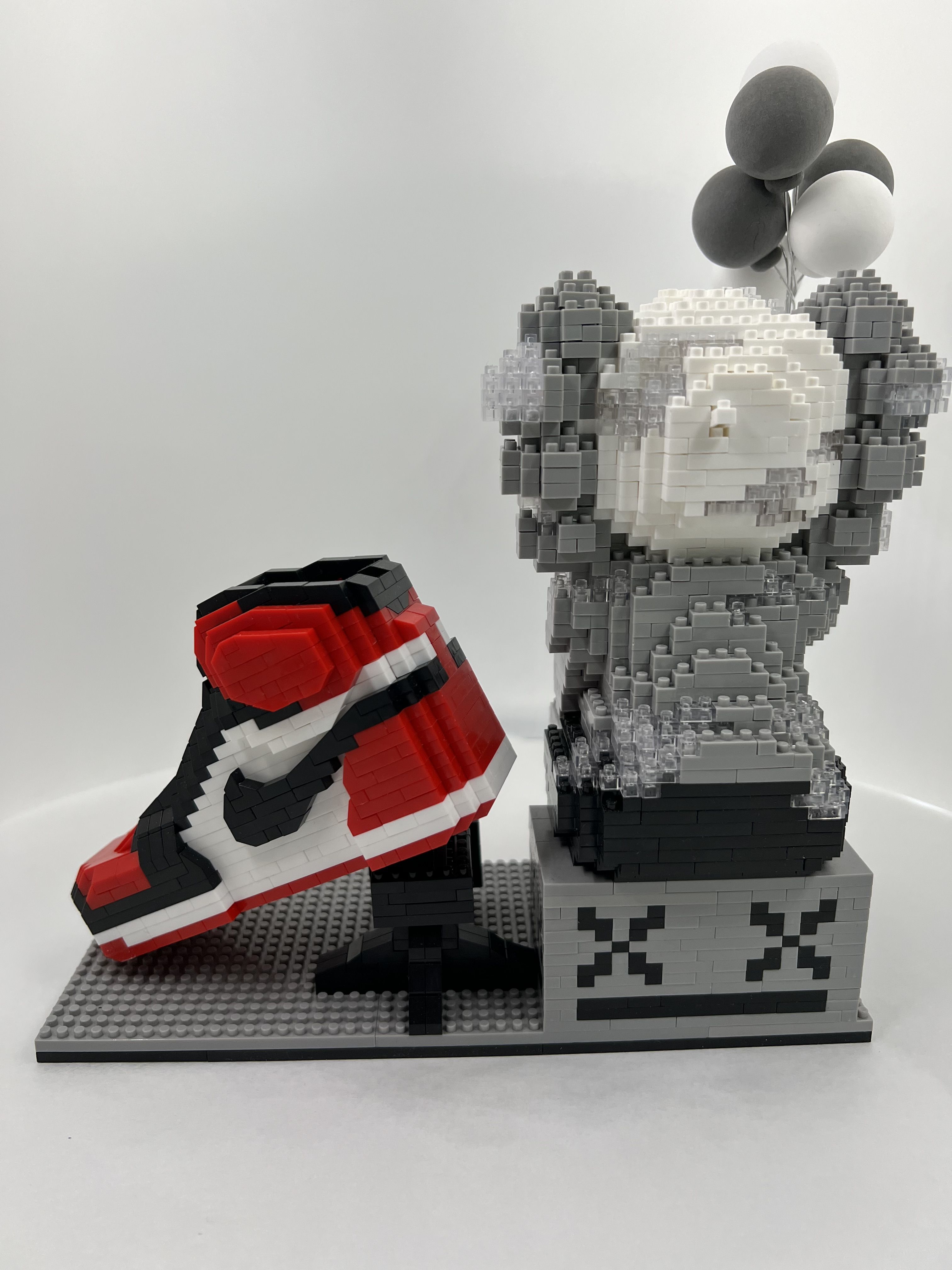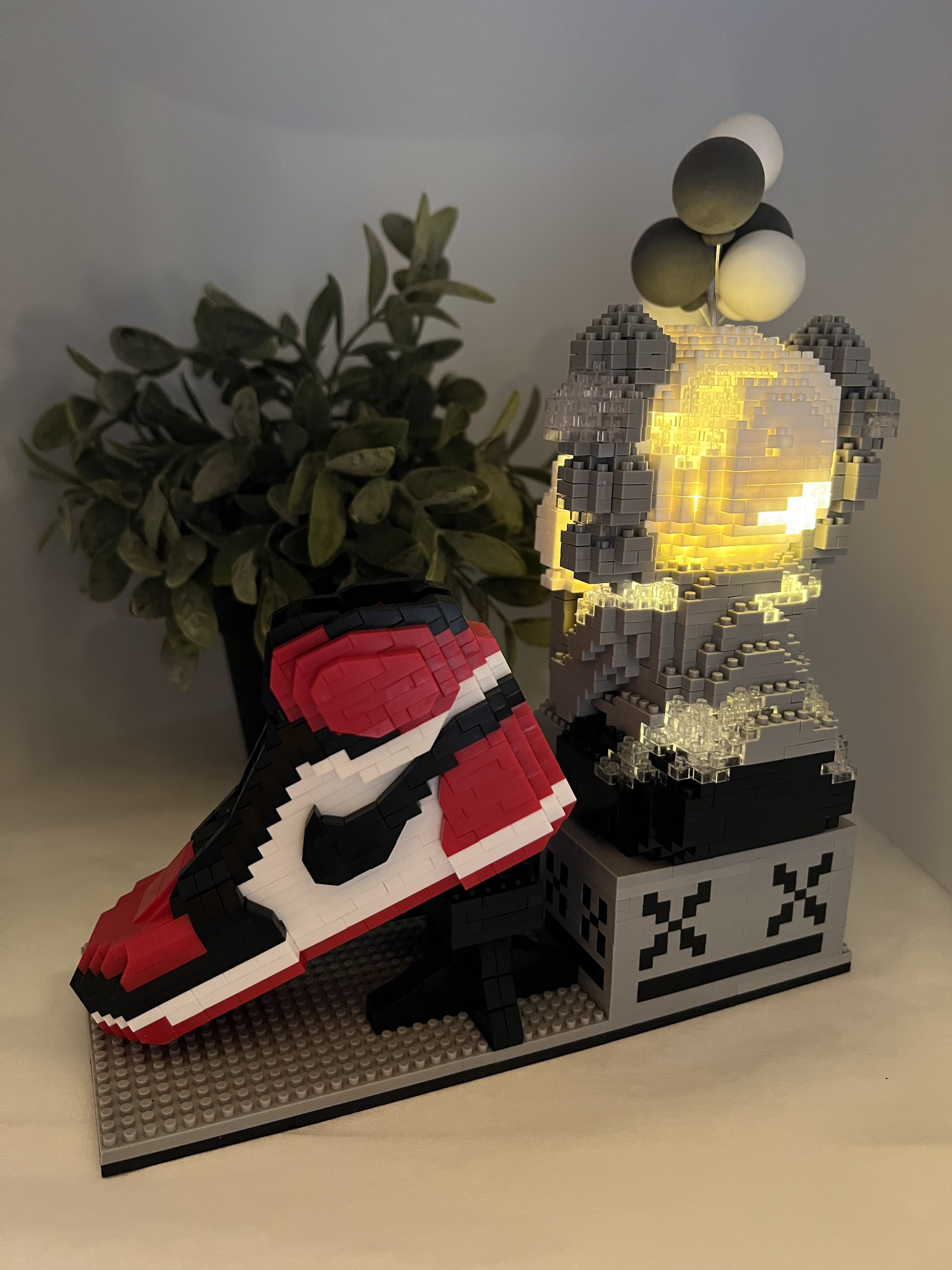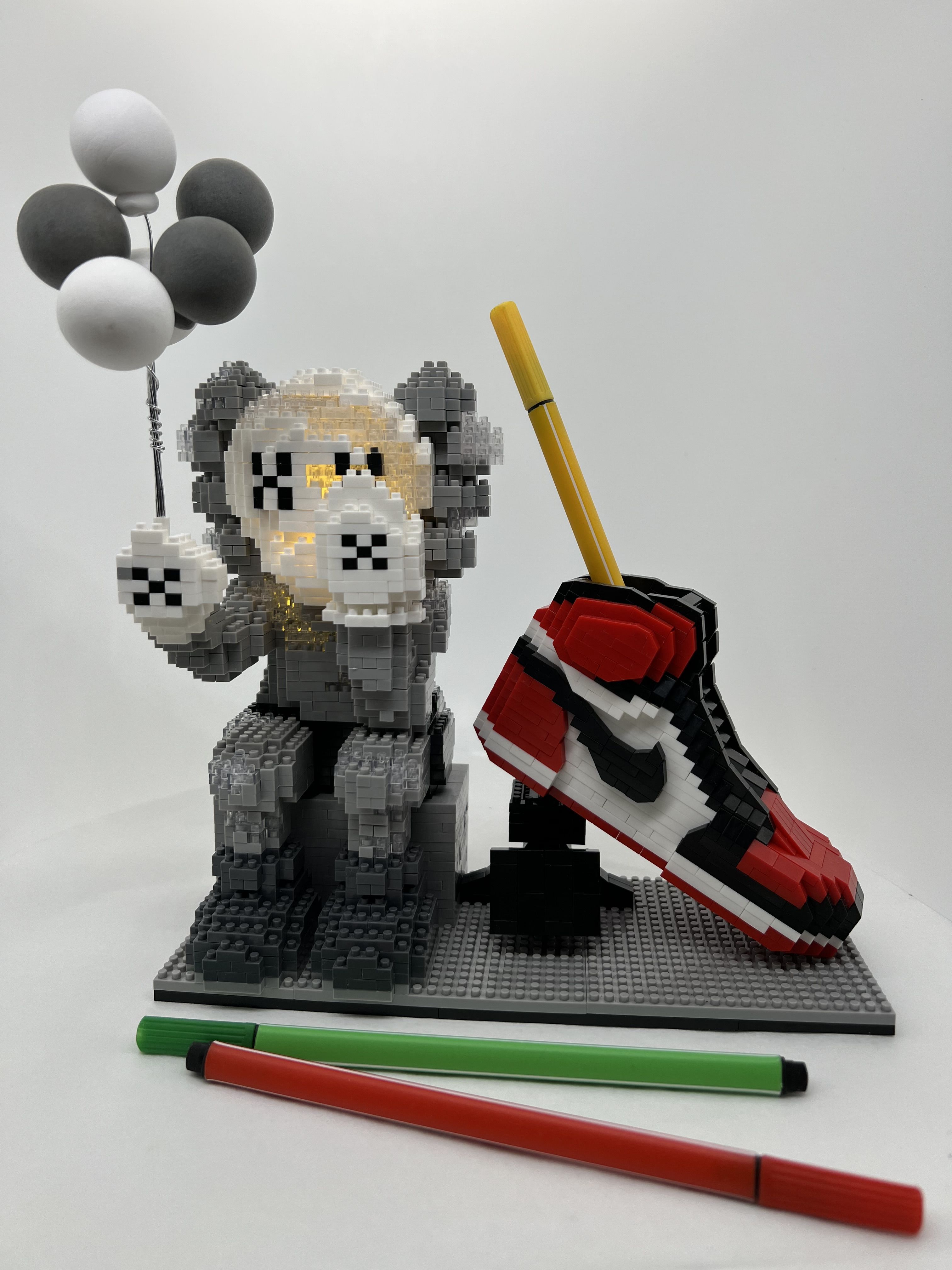 В составе конструктора детали из безопасного пластика, светодиодная нить, воздушные шарики которые держит Kaws.Так же в наборе идет подробная схема сборки,батарейки.