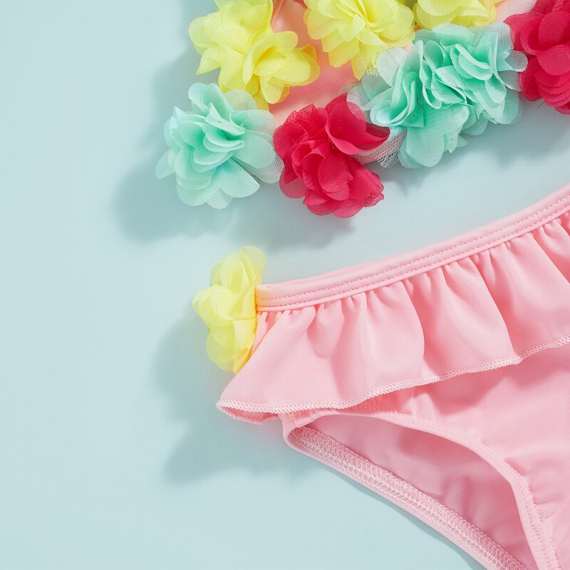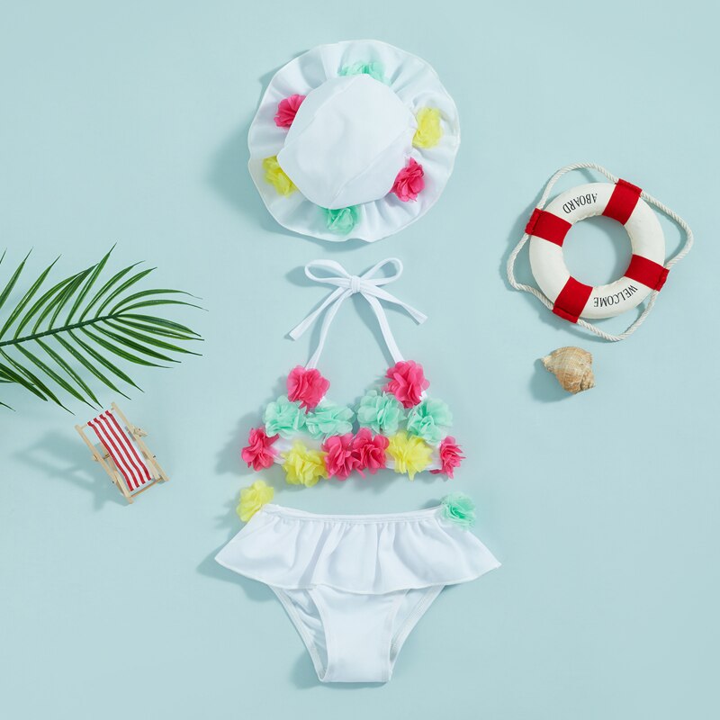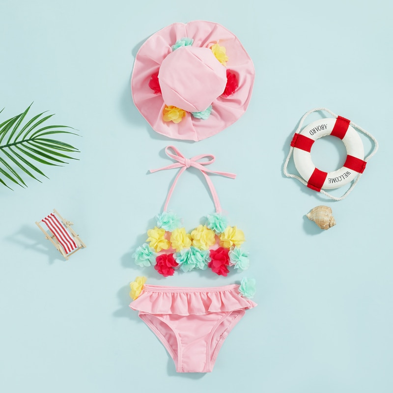 Летние Детские купальники для маленьких девочек, Майки с цветочным рисунком и оборками, шорты, Солнцезащитная шляпа, бикини, раздельные купальники для новорожденных
