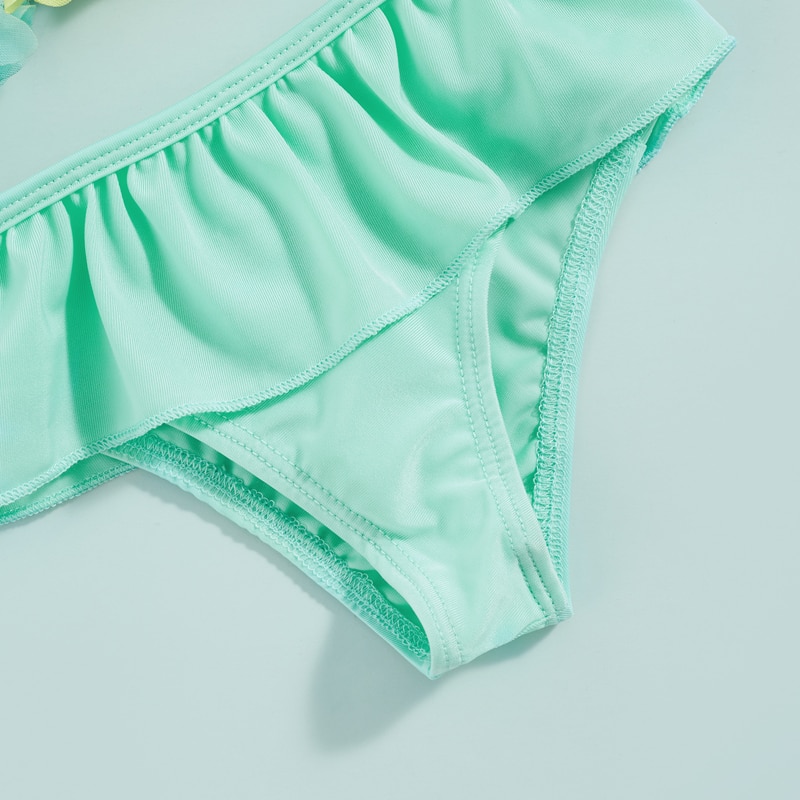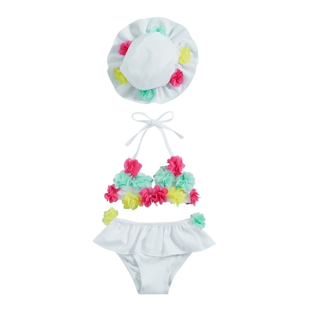 Описание: Купальники из 3 предметов для маленьких девочек Цветочный Декор Майки с завязками на шее и оборками Шорты Шляпа от солнца Бикини Сплит Комплект купальников