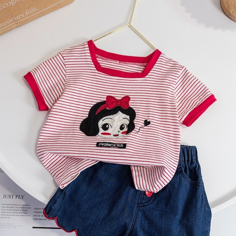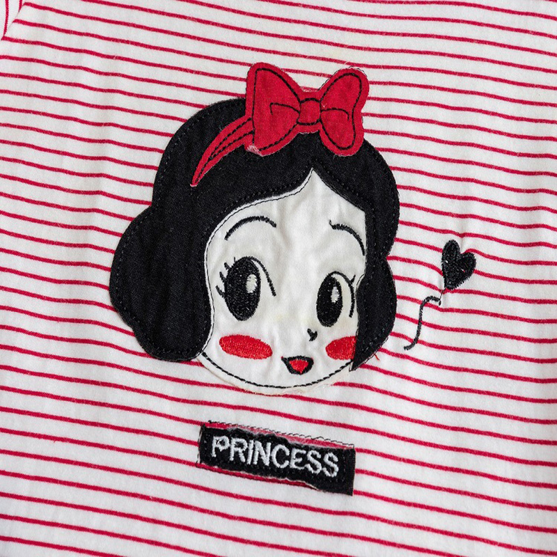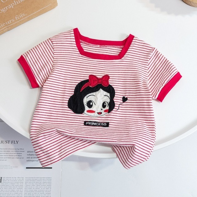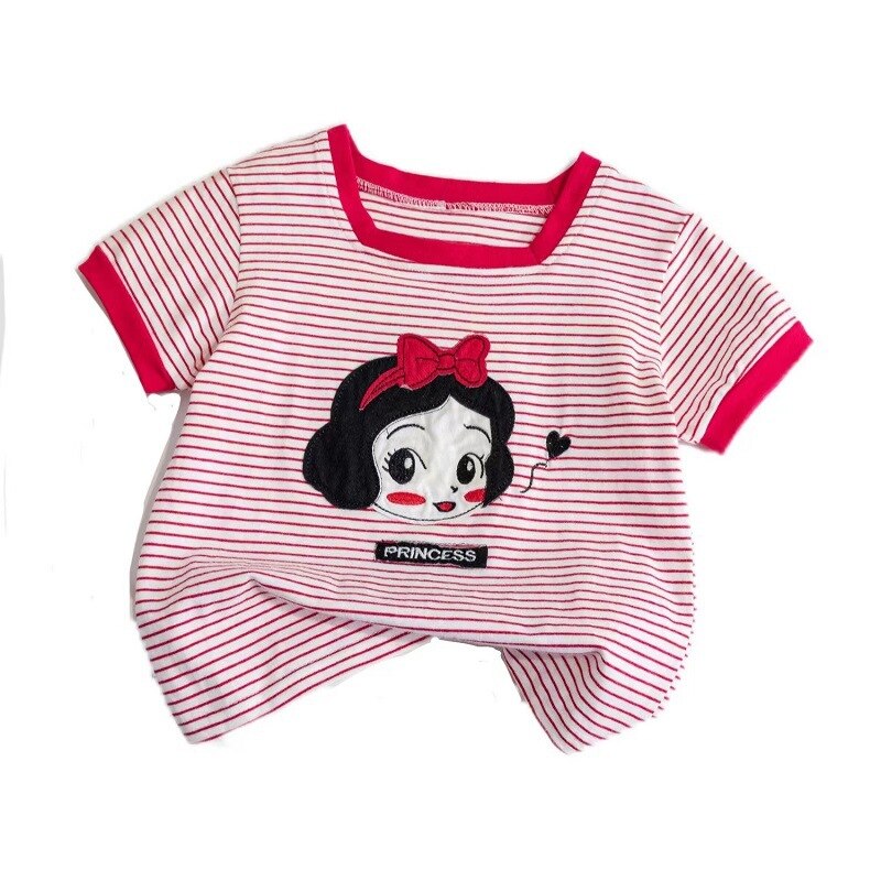 Летние детские топы, Модная хлопковая футболка в полоску с квадратным воротником для девочек, Милая Красная футболка с мультяшным рисунком