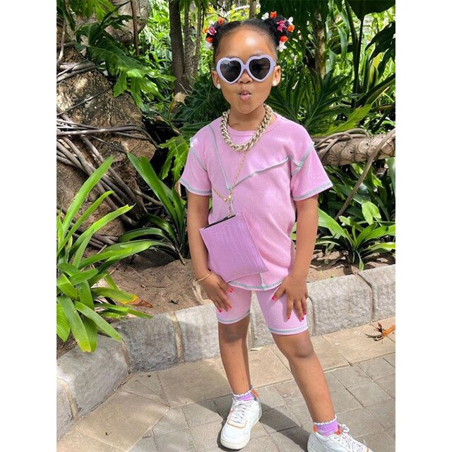 Летние комплекты детской одежды 2023 года, 2 шт., вязаный Свободный Топ + велосипедные шорты, спортивный тренировочный костюм с небольшим минимальным заказом, уличные комплекты Y2K для маленьких девочек