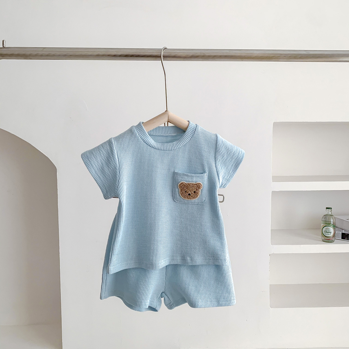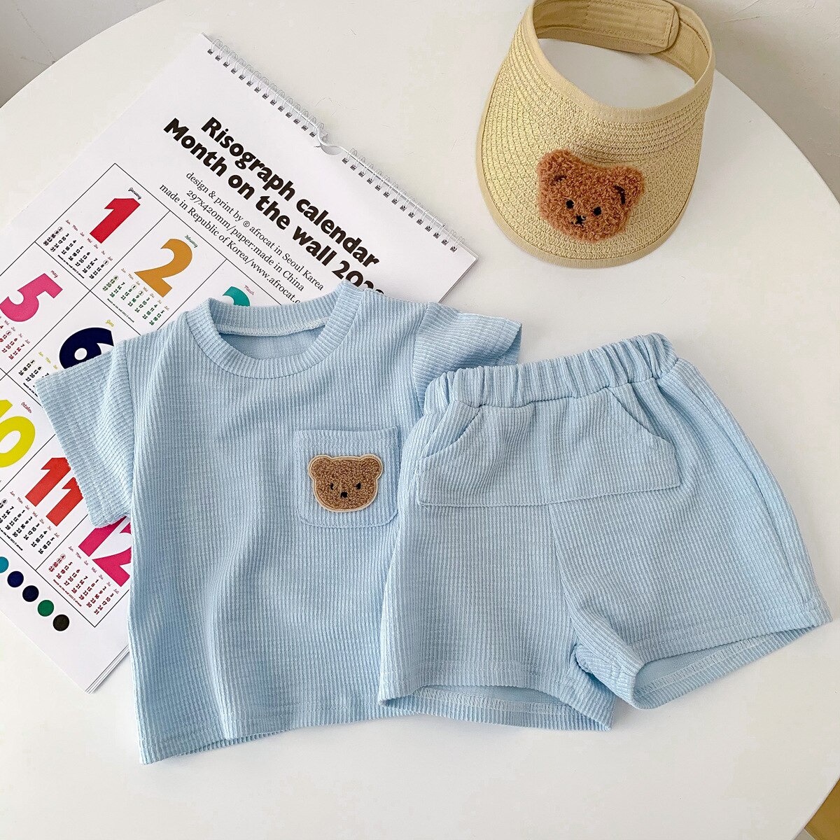 Летние комплекты детской одежды с милым медведем, спортивные костюмы из 2 предметов для мальчиков и девочек, хлопковая вафельная футболка и короткие штаны, детские костюмы