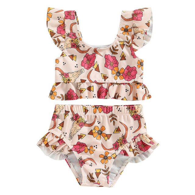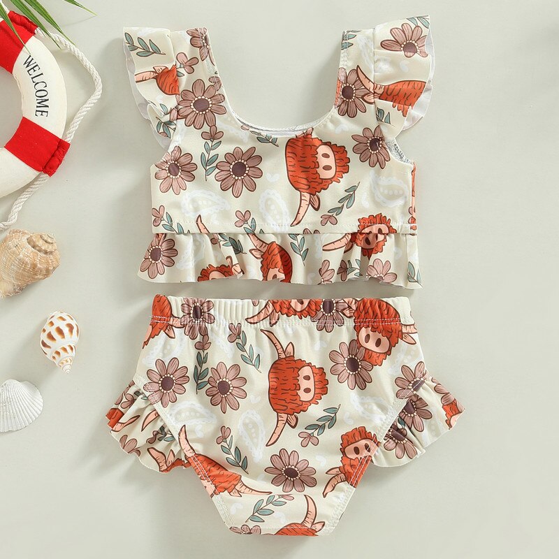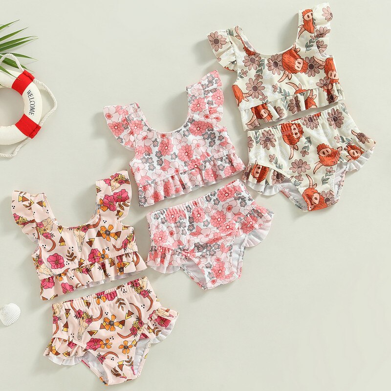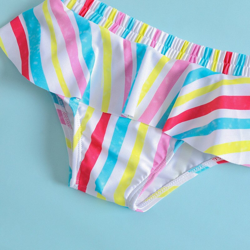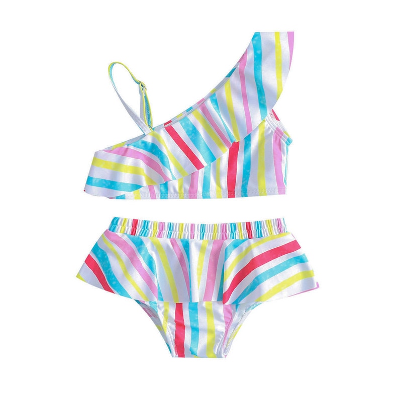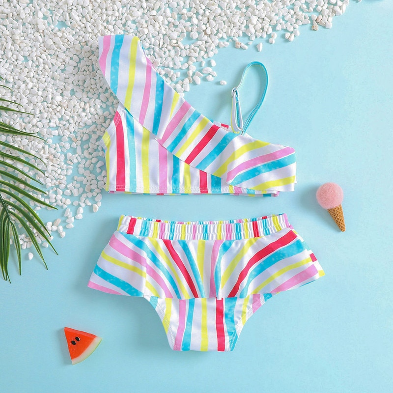 Летние комплекты для купания для маленьких девочек, топы без рукавов на одно плечо + стринги в полоску с оборками