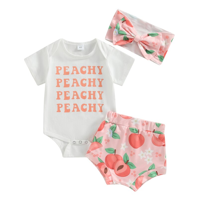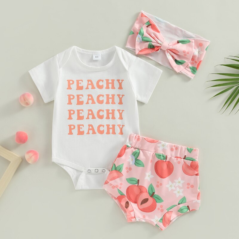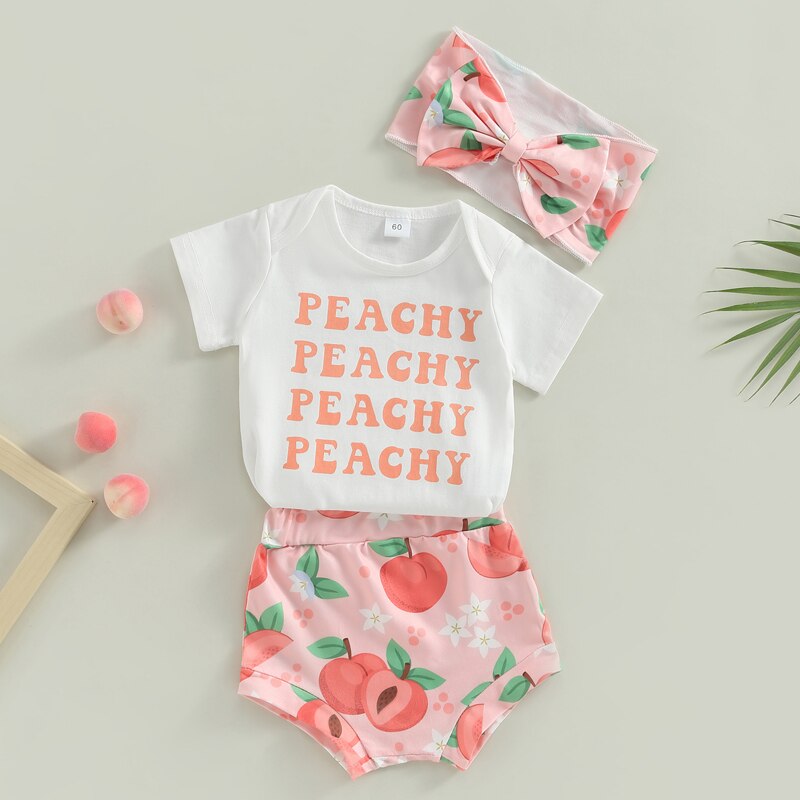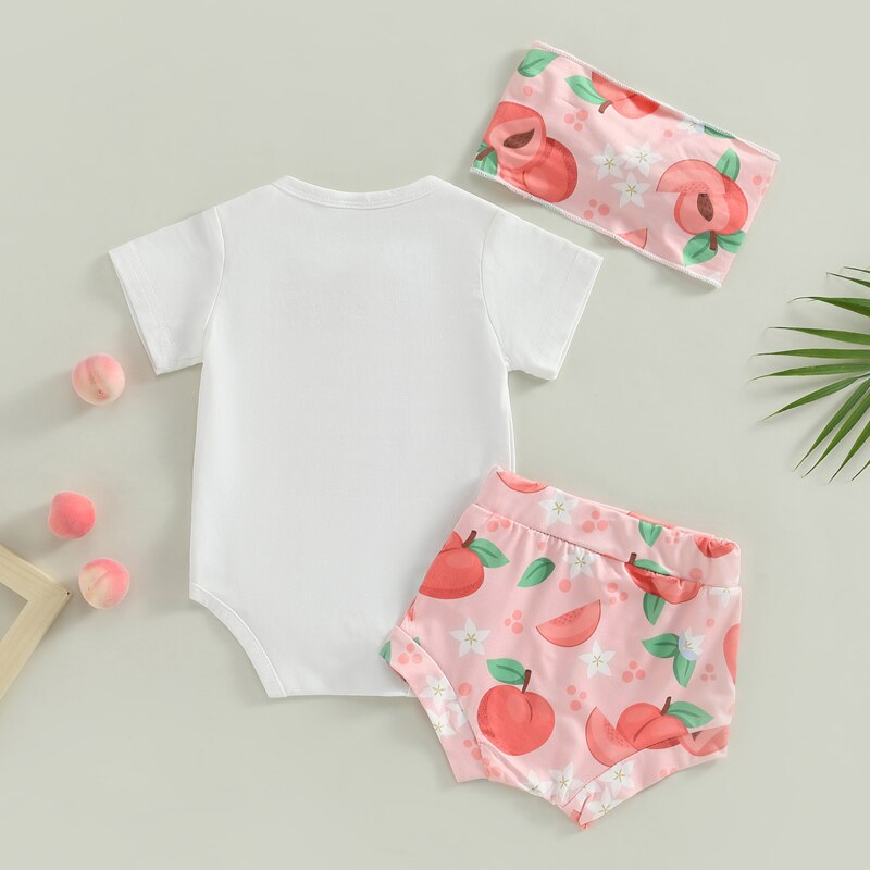 Летние комплекты одежды для маленьких девочек, комбинезон с коротким рукавом и шорты с персиковым принтом, комплект с повязкой на голову