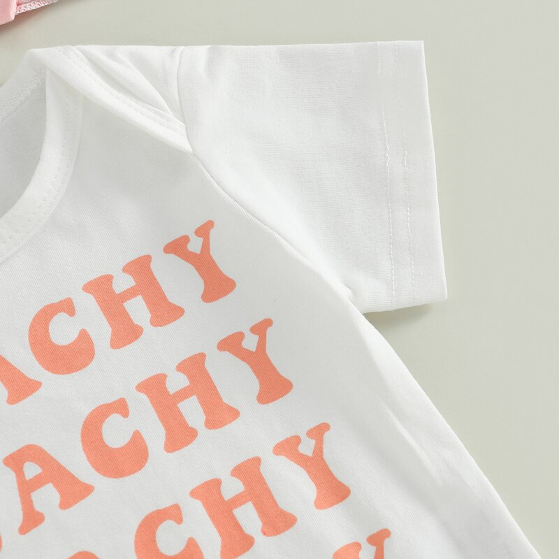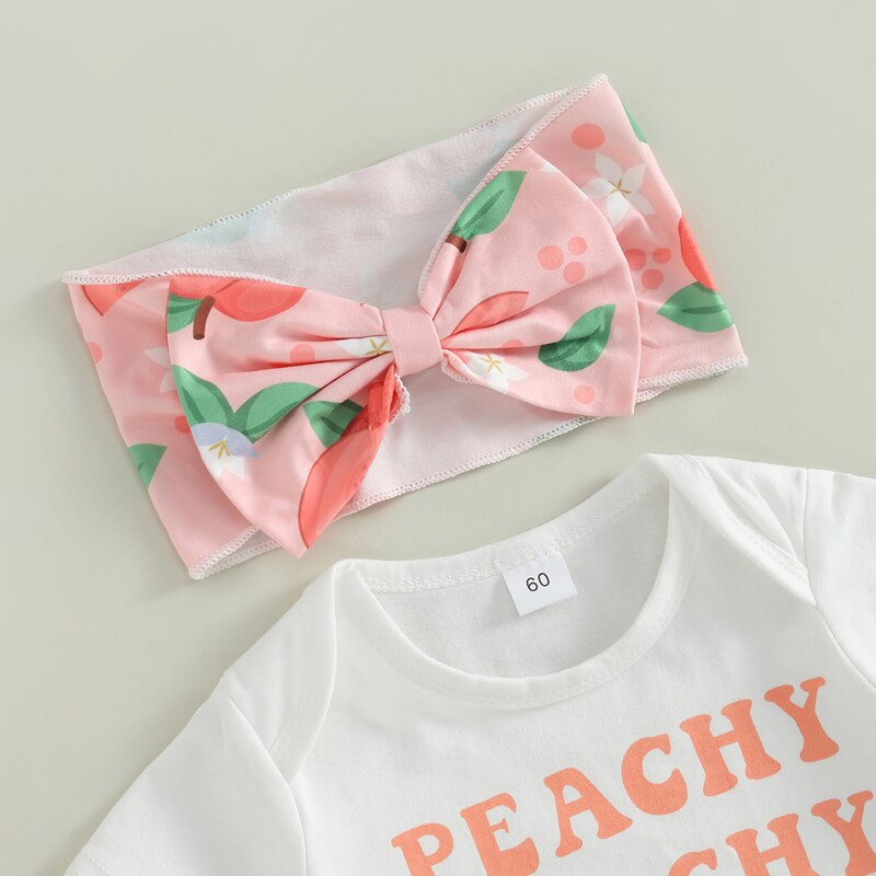 Буквенный принт, круглый вырез, Летний комбинезон с короткими рукавами для новорожденных, эластичные повседневные шорты, дизайн с персиковым принтом, с эластичной повязкой на голову, вашей маленькой девочке понравится такой милый наряд.