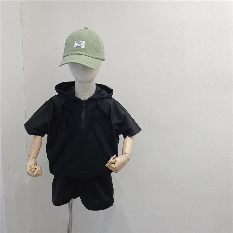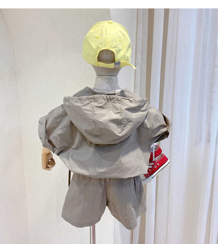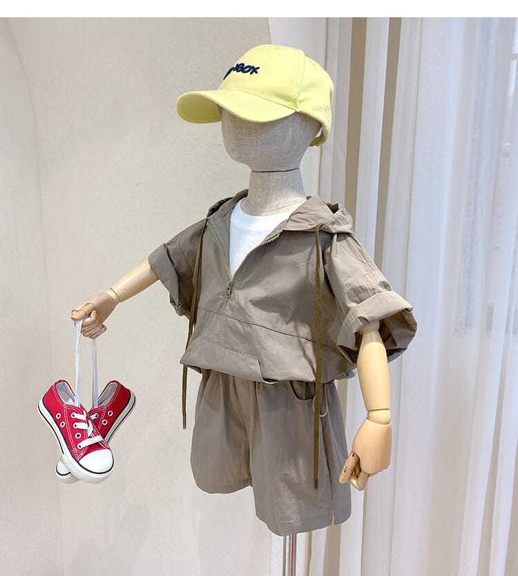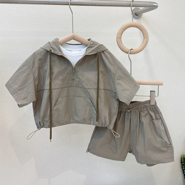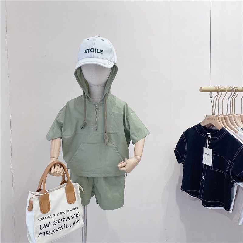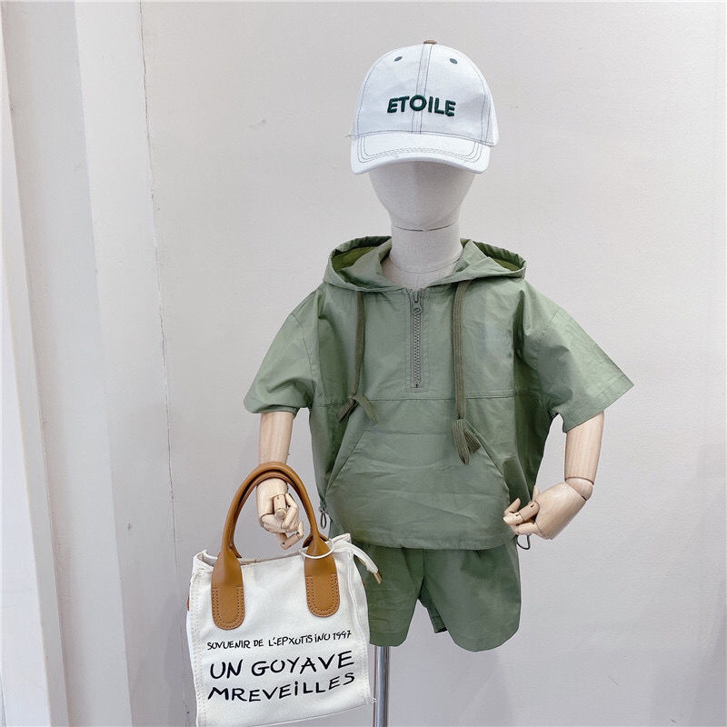 Летние костюмы для мальчиков, новинка 2022, корейские детские удобные костюмы с коротким рукавом и капюшоном для малышей из двух предметов, модная одежда для маленьких мальчиков