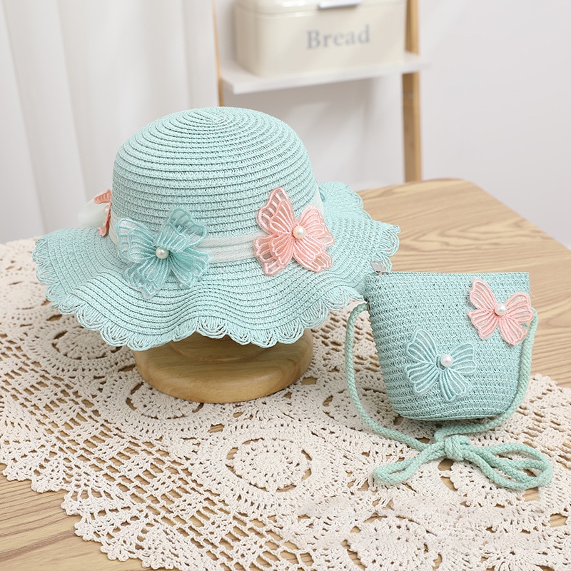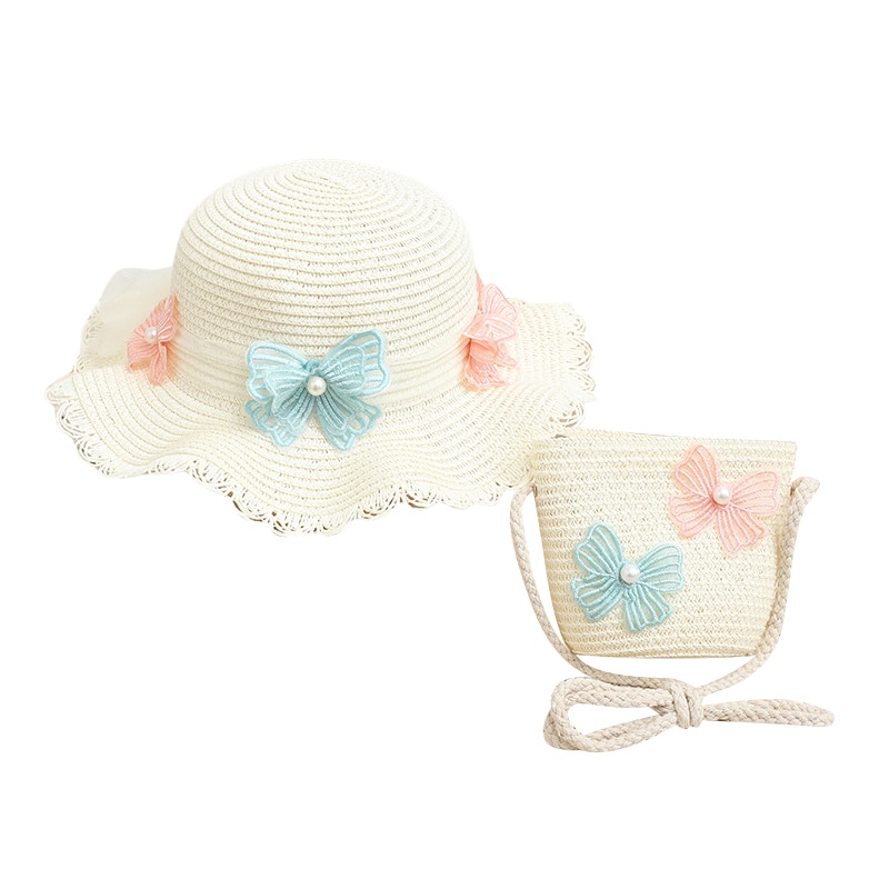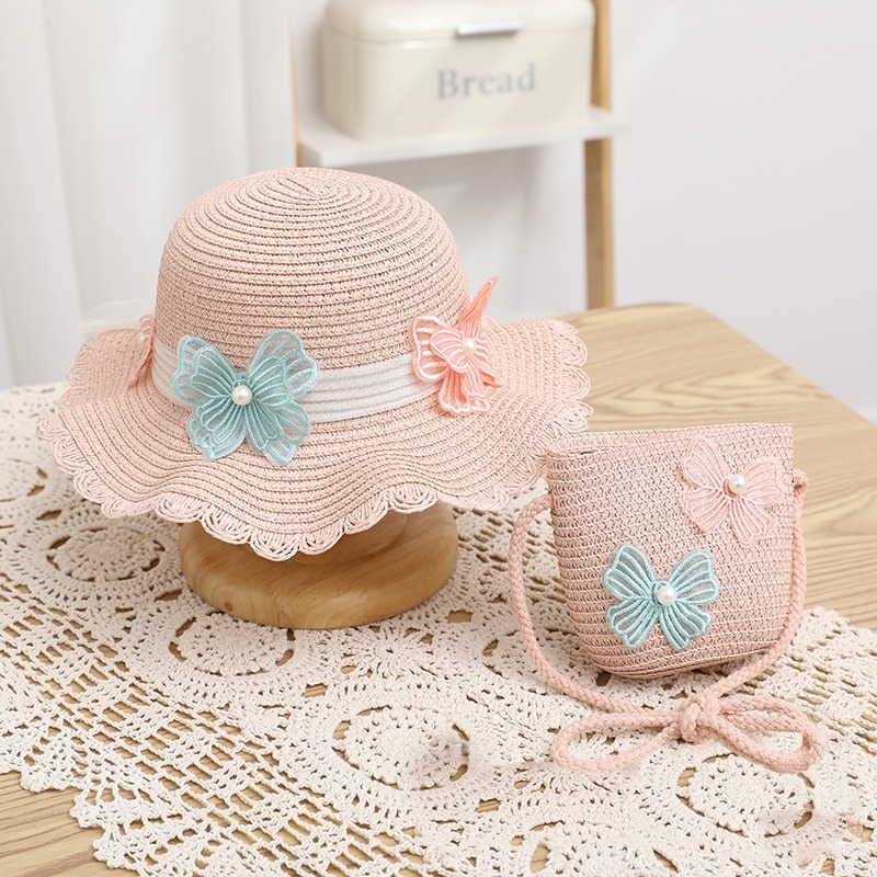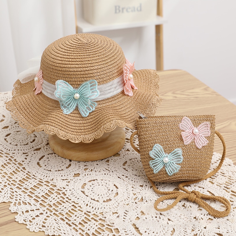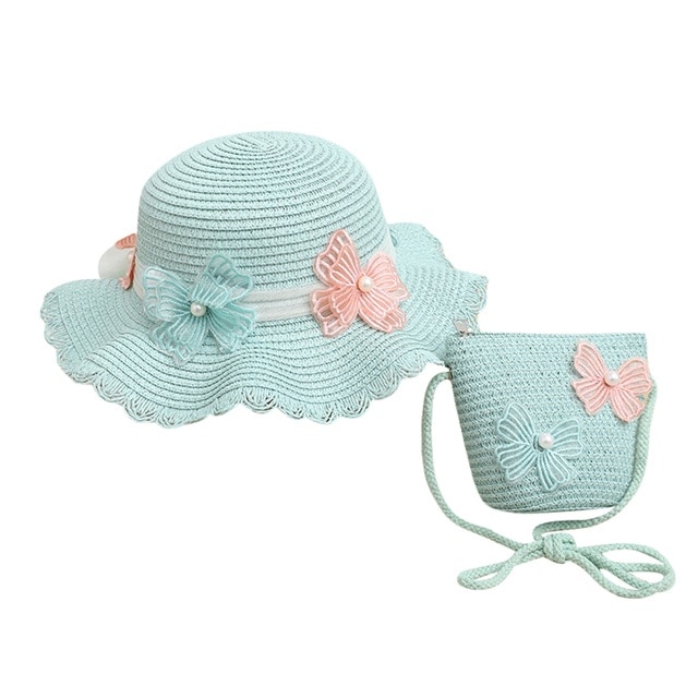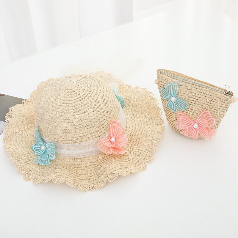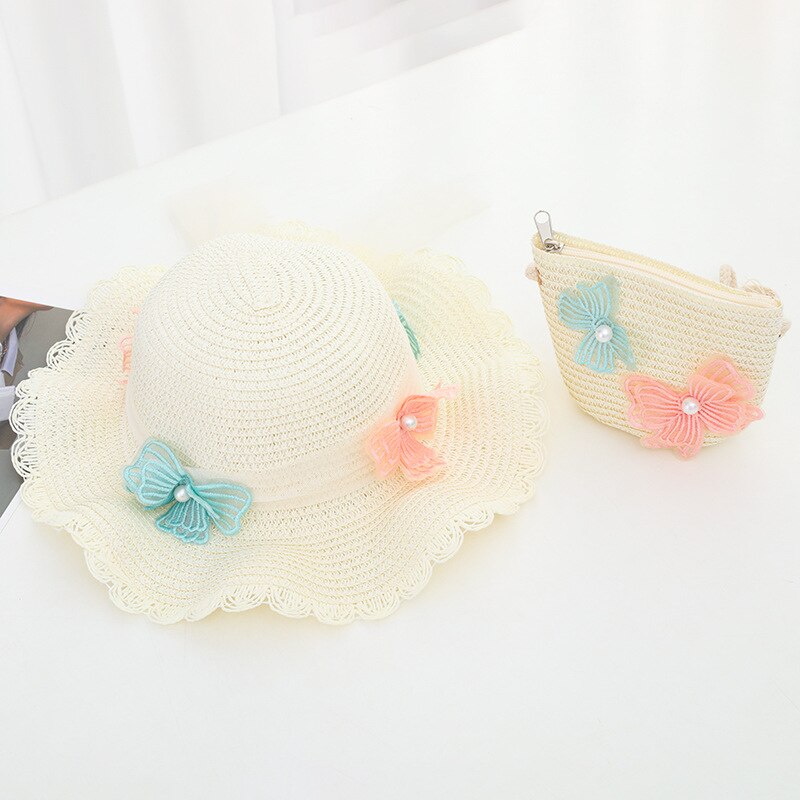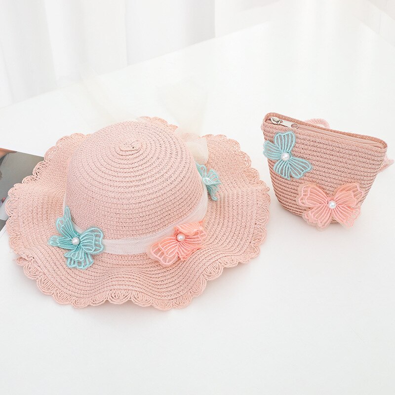 Описание: Летняя соломенная шляпа от солнца для маленьких девочек, детские летние защитные Двусторонние Шапки с широкими полями и бантом, наборы сумок через плечо