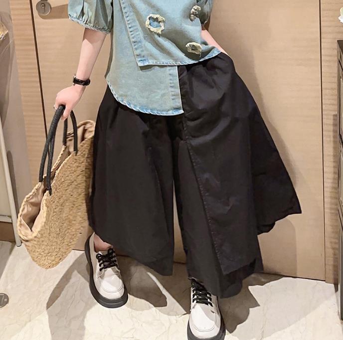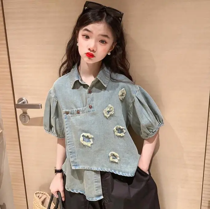 Летний комплект для девочек, новинка 2023, модная летняя джинсовая рубашка для маленьких девочек, хлопковые брюки, комплект из двух предметов