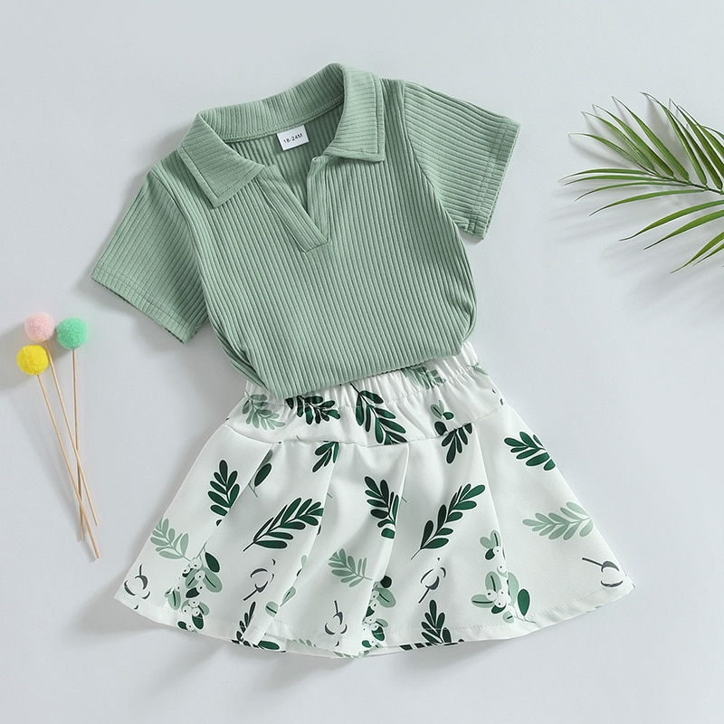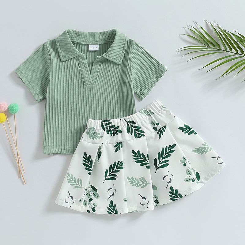 Описание: Летняя Одежда для маленьких девочек 2PCS, топы с воротником с коротким рукавом + мини-плиссированная юбка