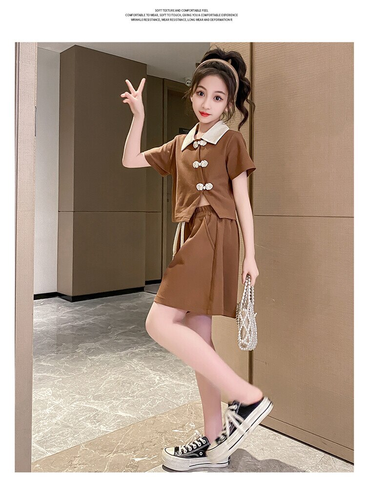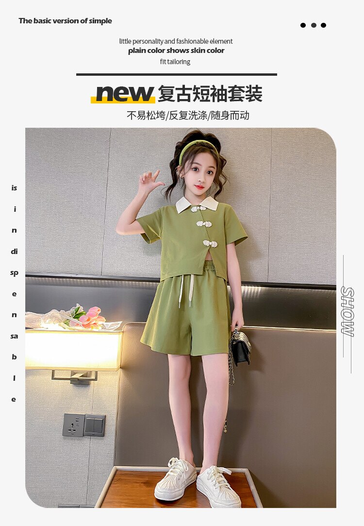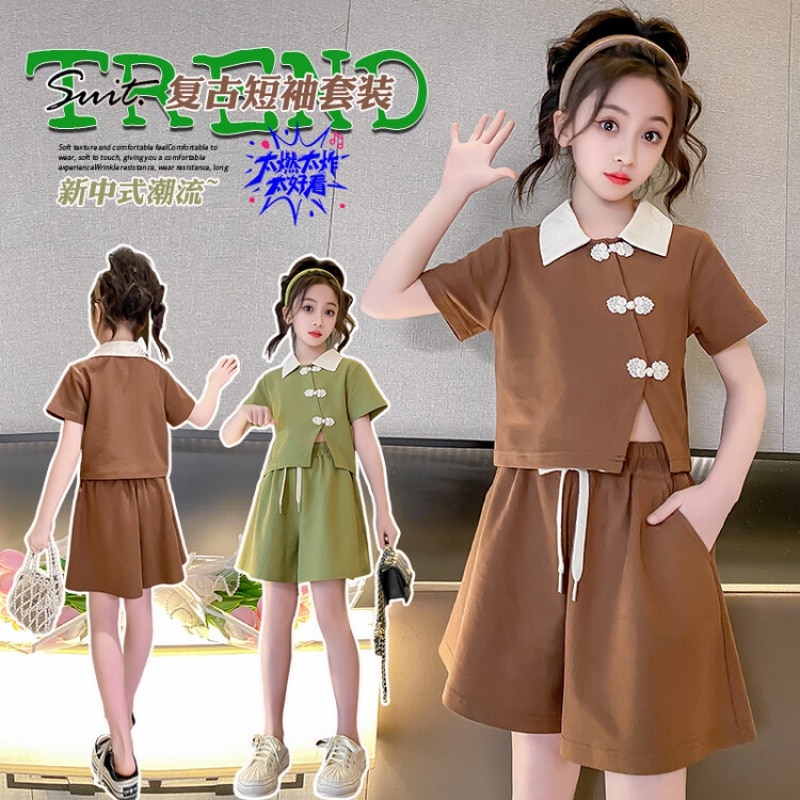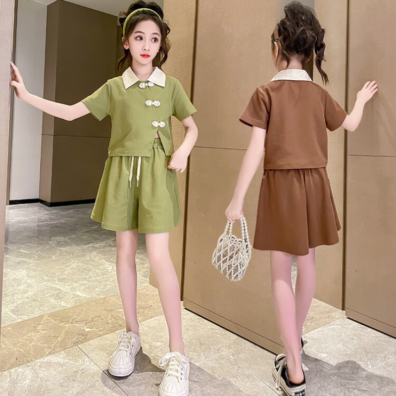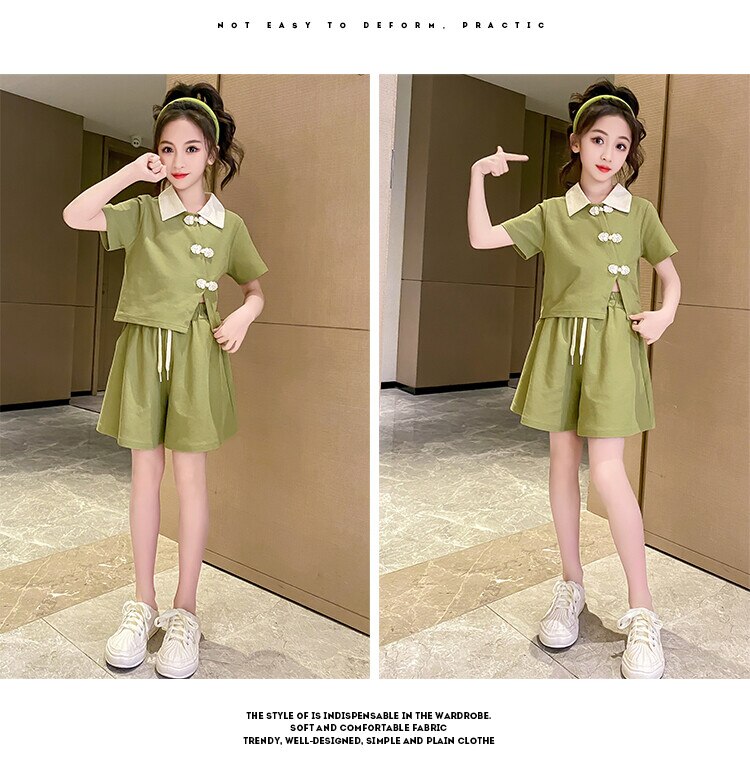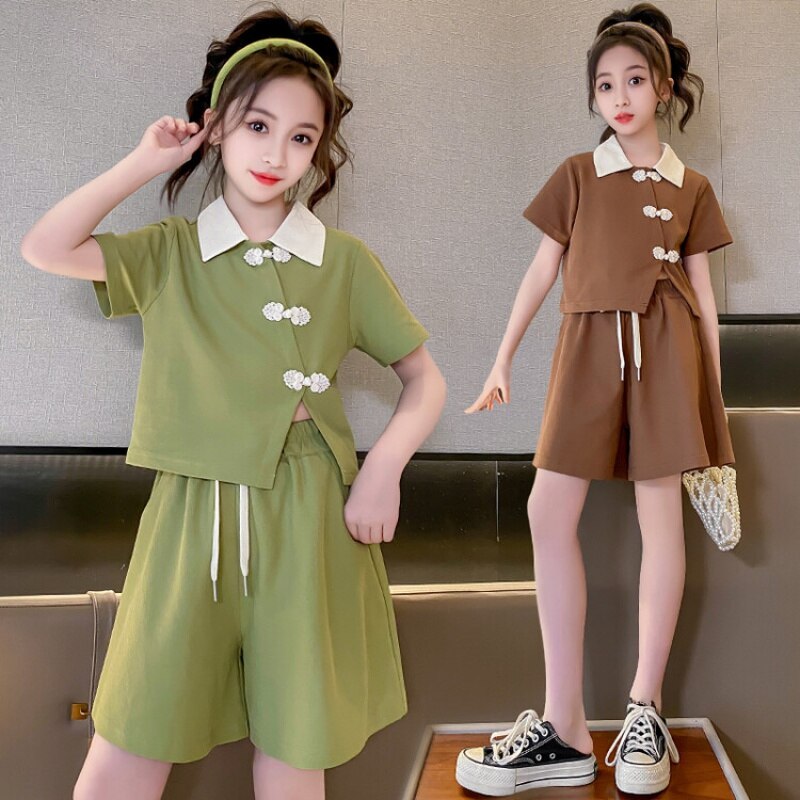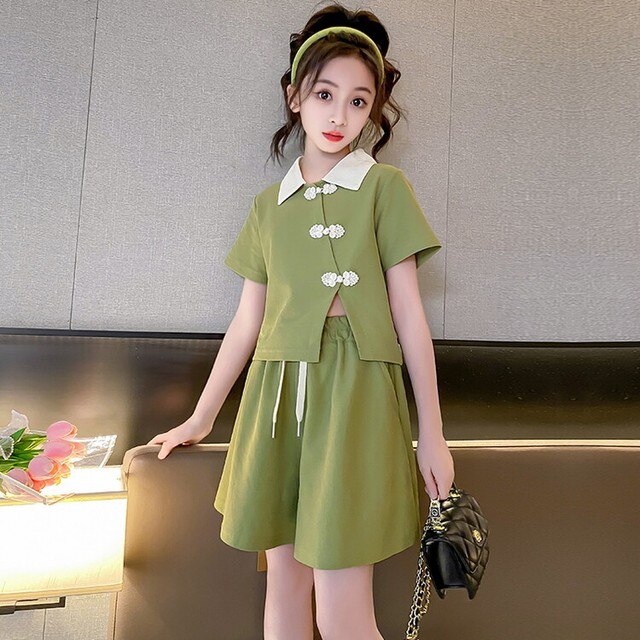 Летний костюм для девочек с коротким рукавом и шортами, 2 предмета, повседневный костюм в стиле преппи в стиле ретро, детская одежда для девочек, Подростковая детская одежда