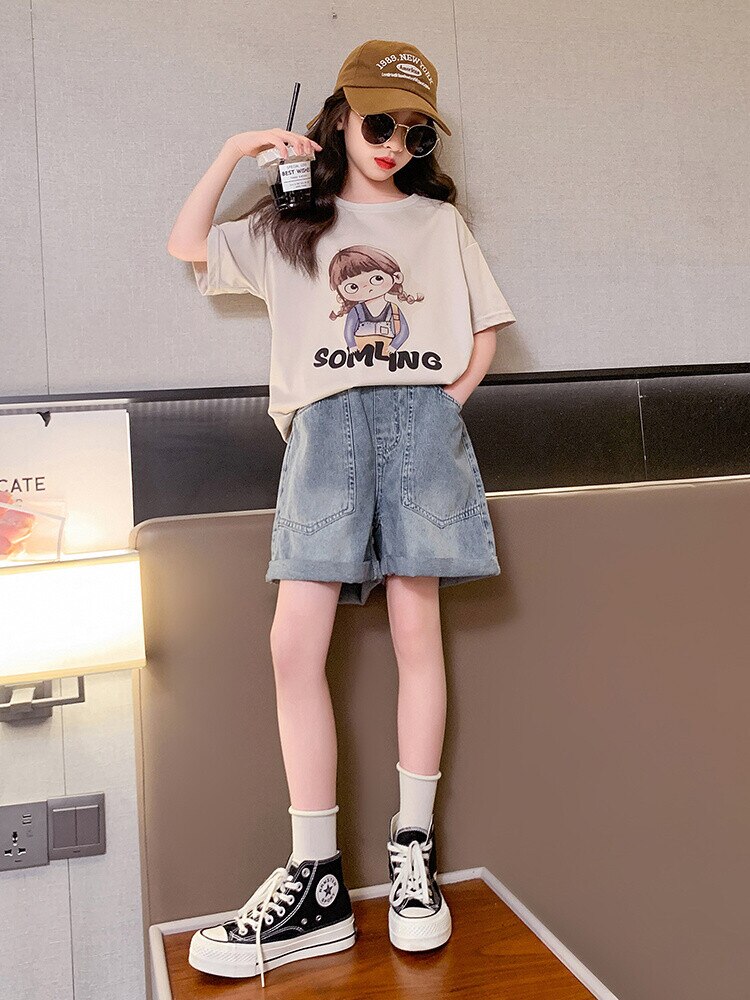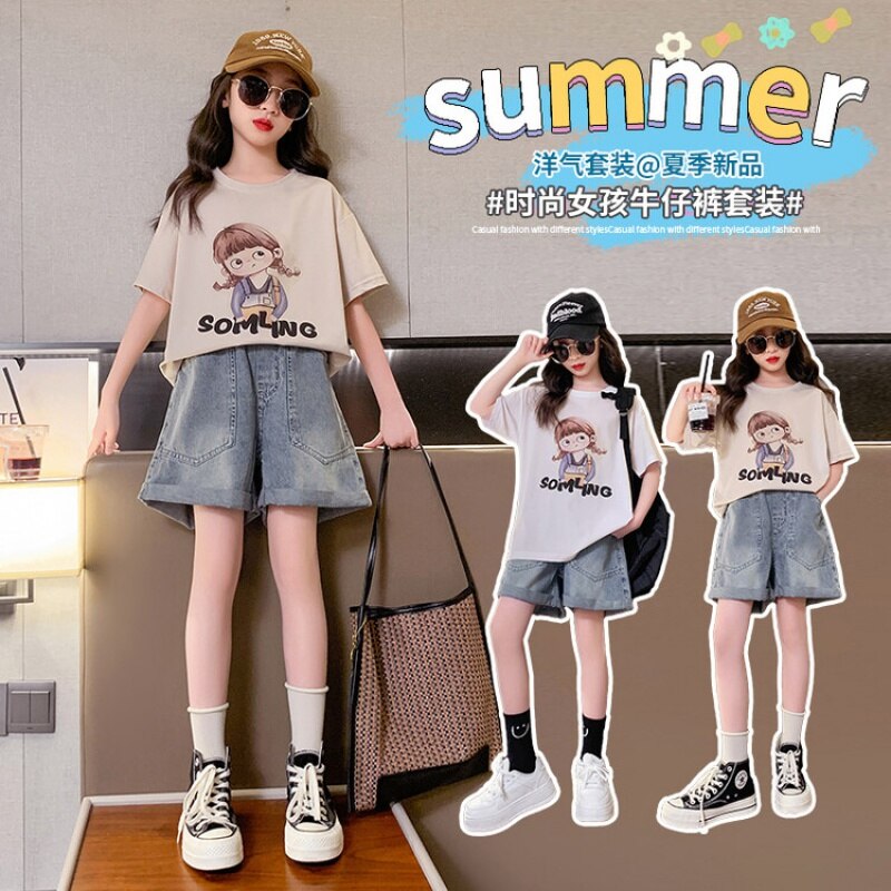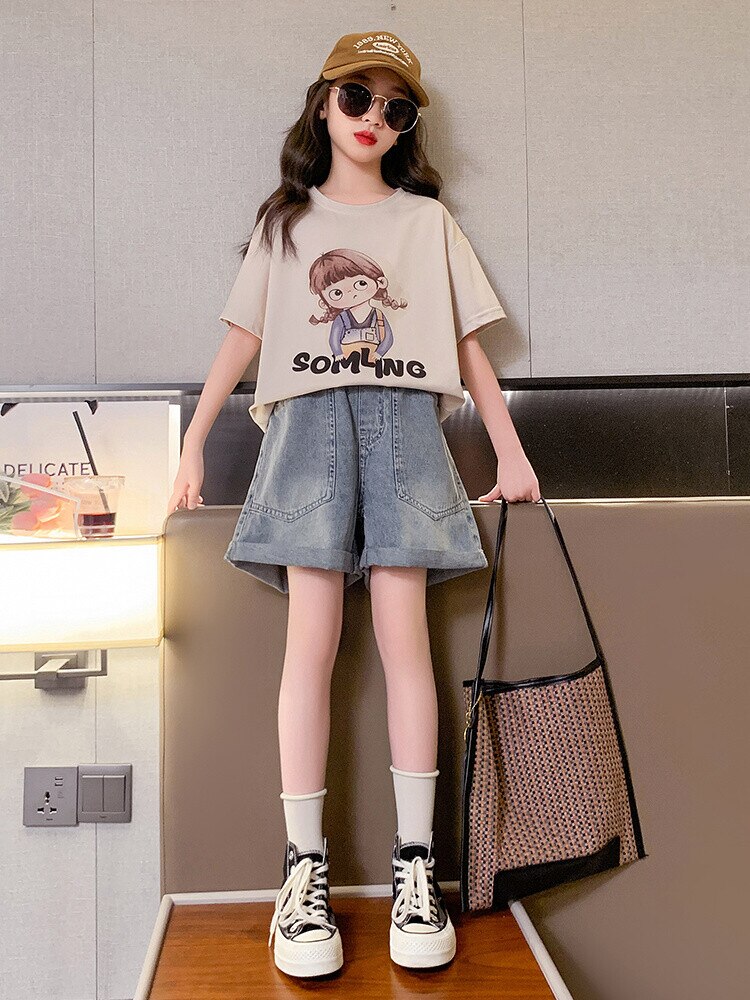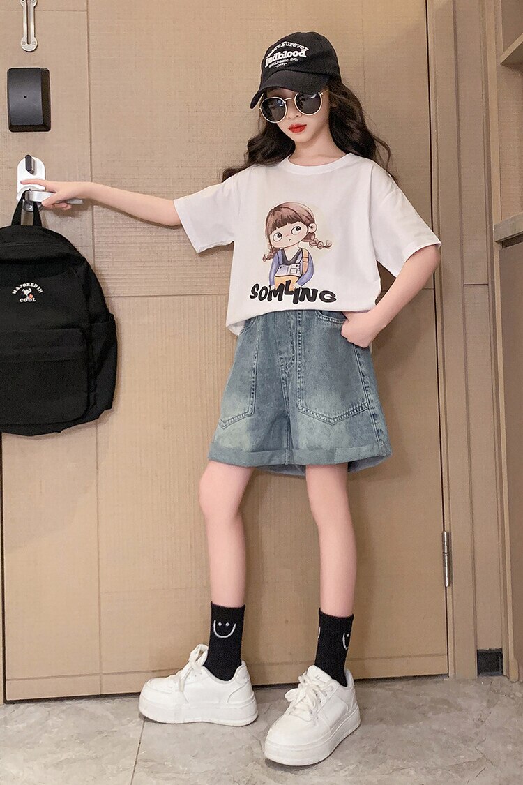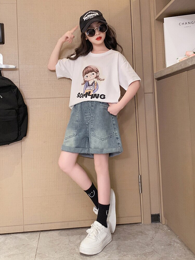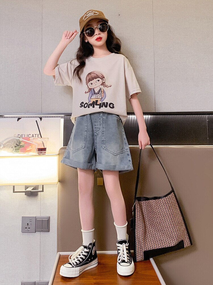 Летний костюм для девочек, шорты с коротким рукавом, комплект из 2 предметов, повседневный СВОБОДНЫЙ Модный костюм в студенческом стиле, детская одежда для девочек, подростков