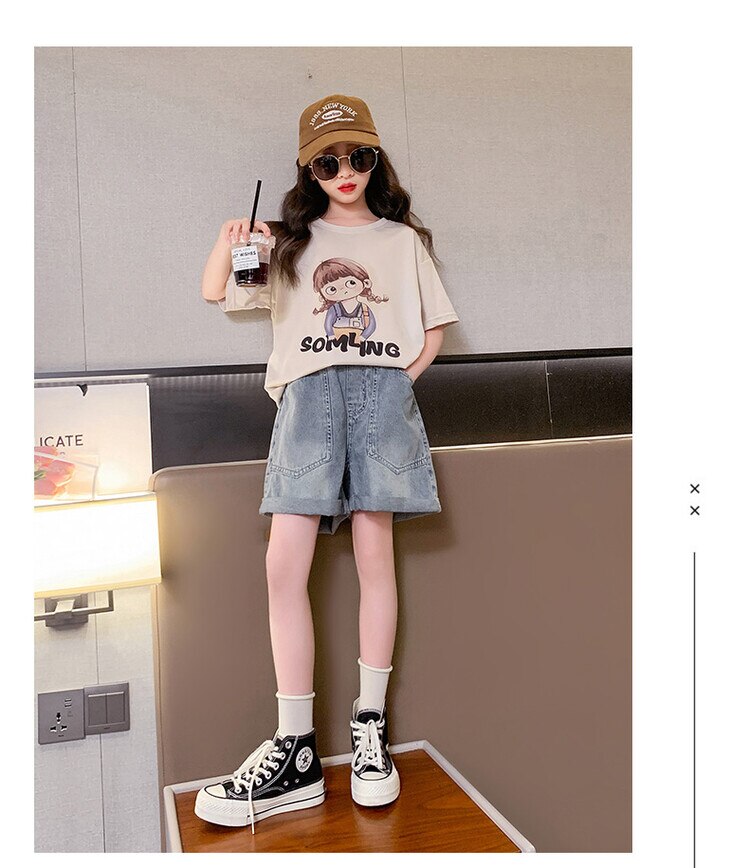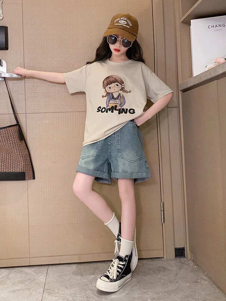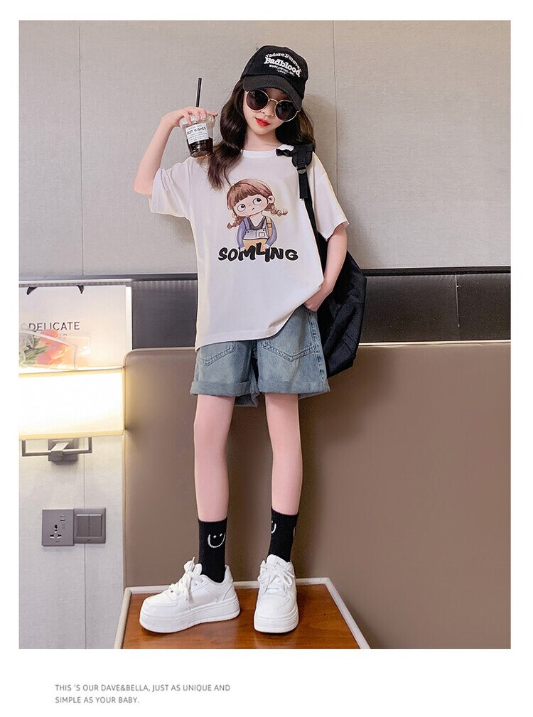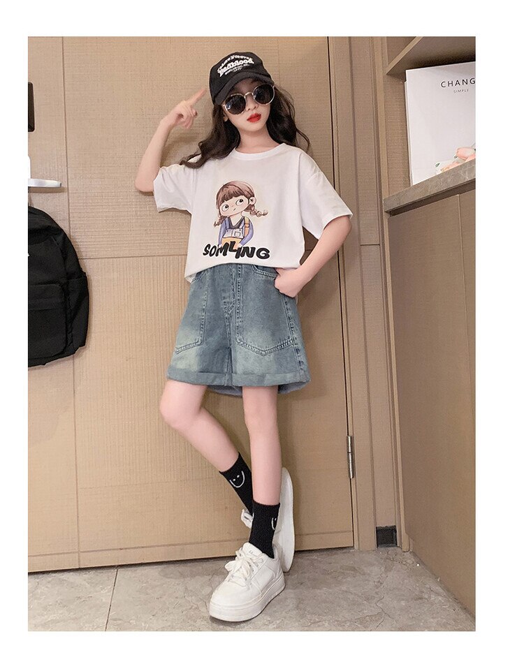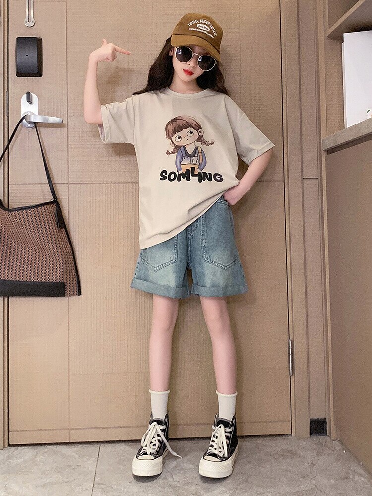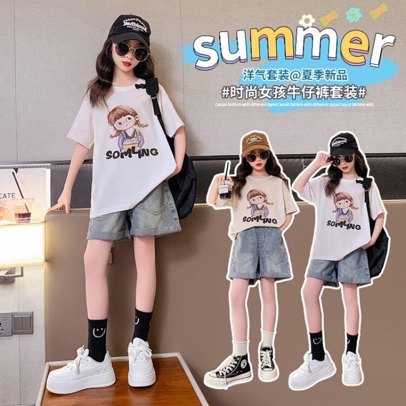 Летний костюм для девочек, шорты с коротким рукавом, комплект из 2 предметов, повседневный СВОБОДНЫЙ Модный костюм в студенческом стиле, детская одежда для девочек, подростков