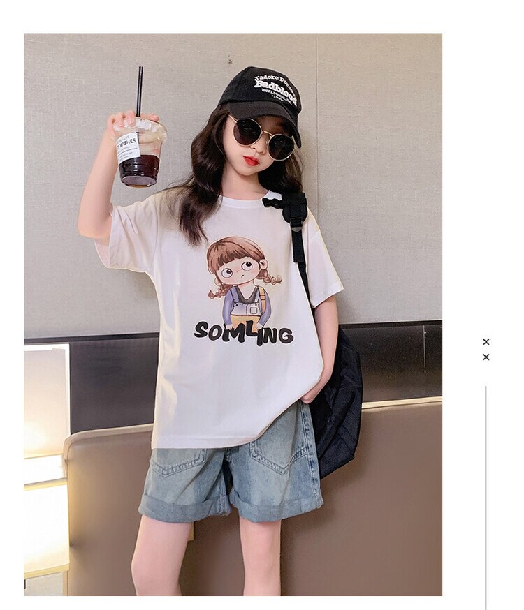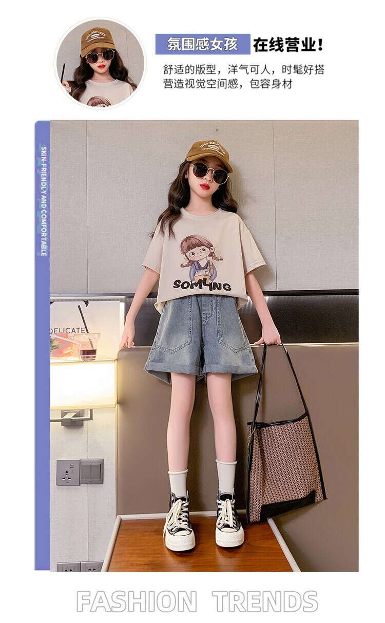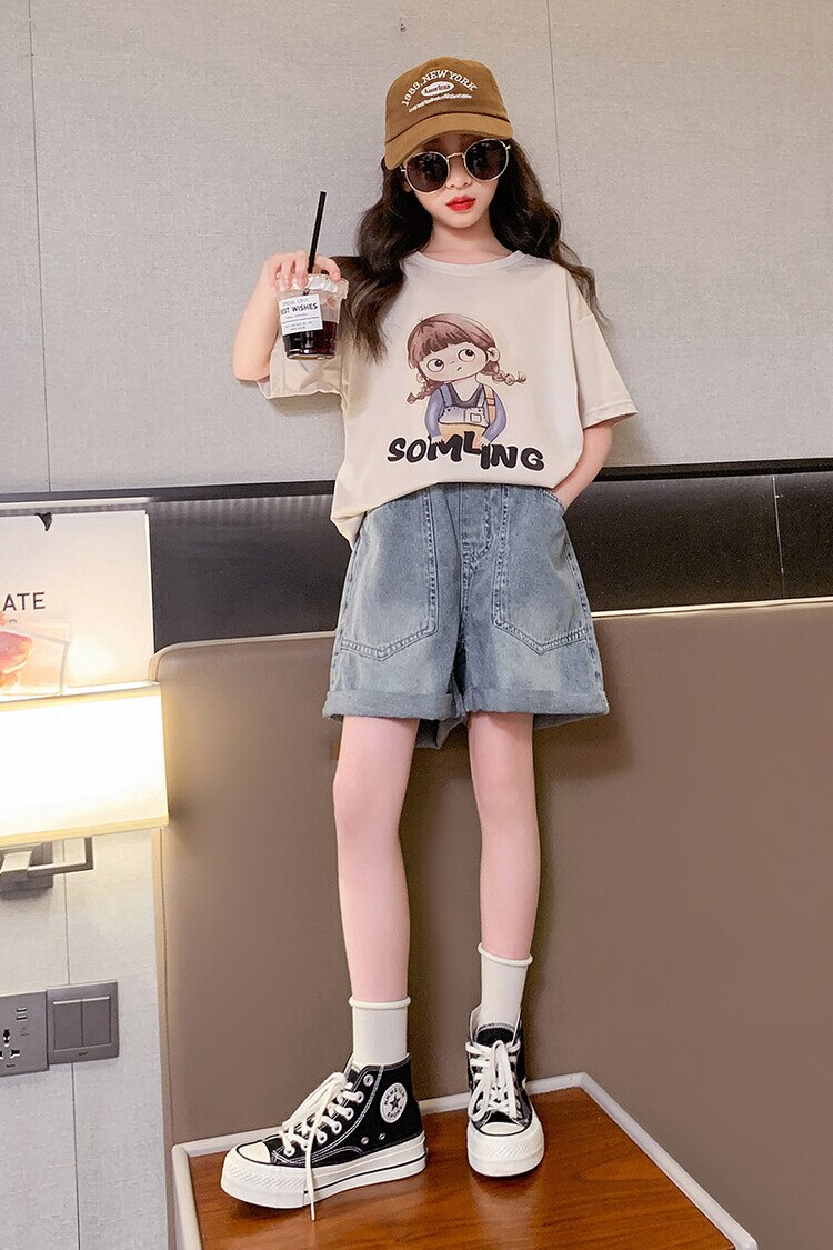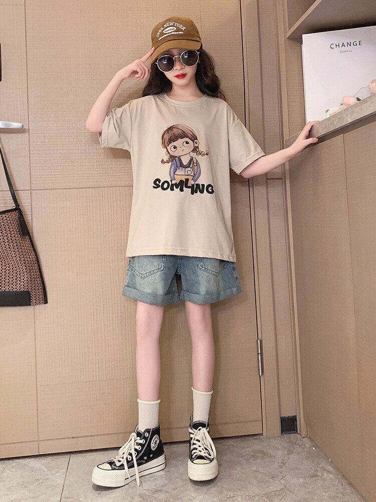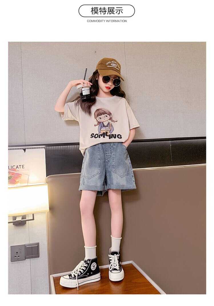Летний костюм для девочек, шорты с коротким рукавом, комплект из 2 предметов, повседневный СВОБОДНЫЙ Модный костюм в студенческом стиле, детская одежда для девочек, подростков