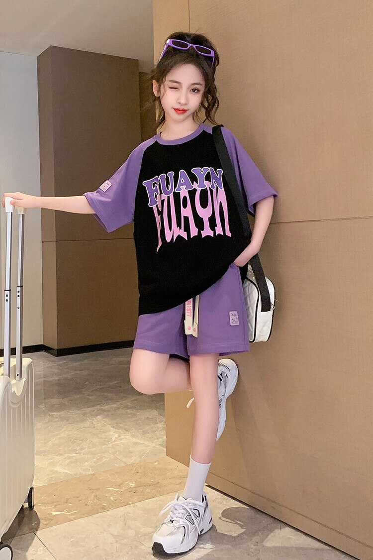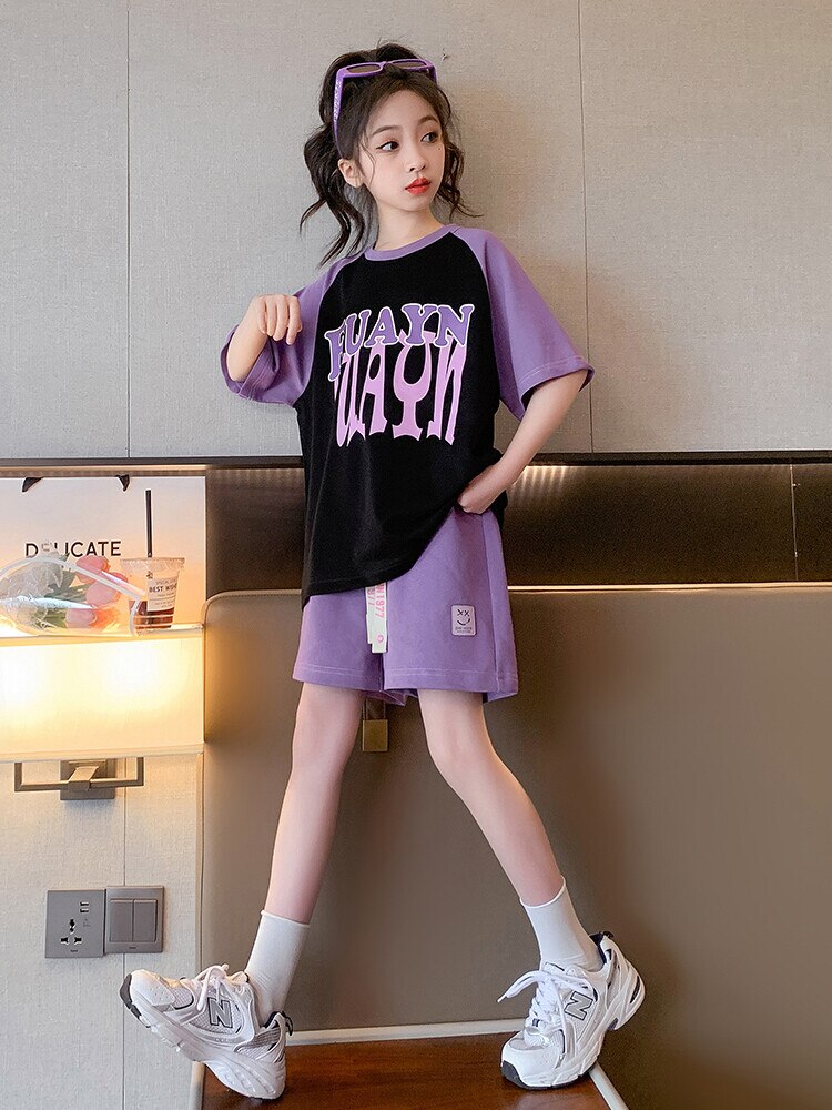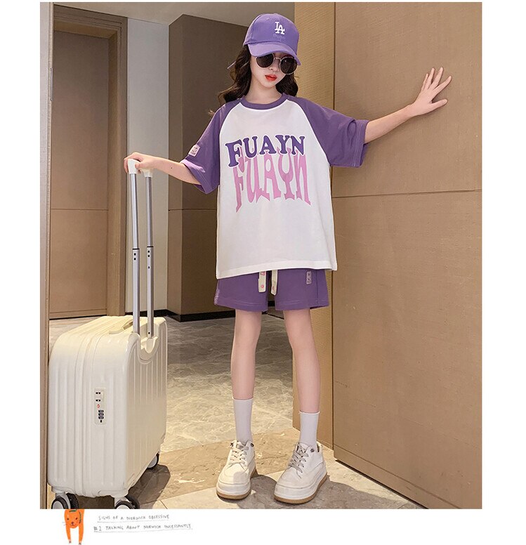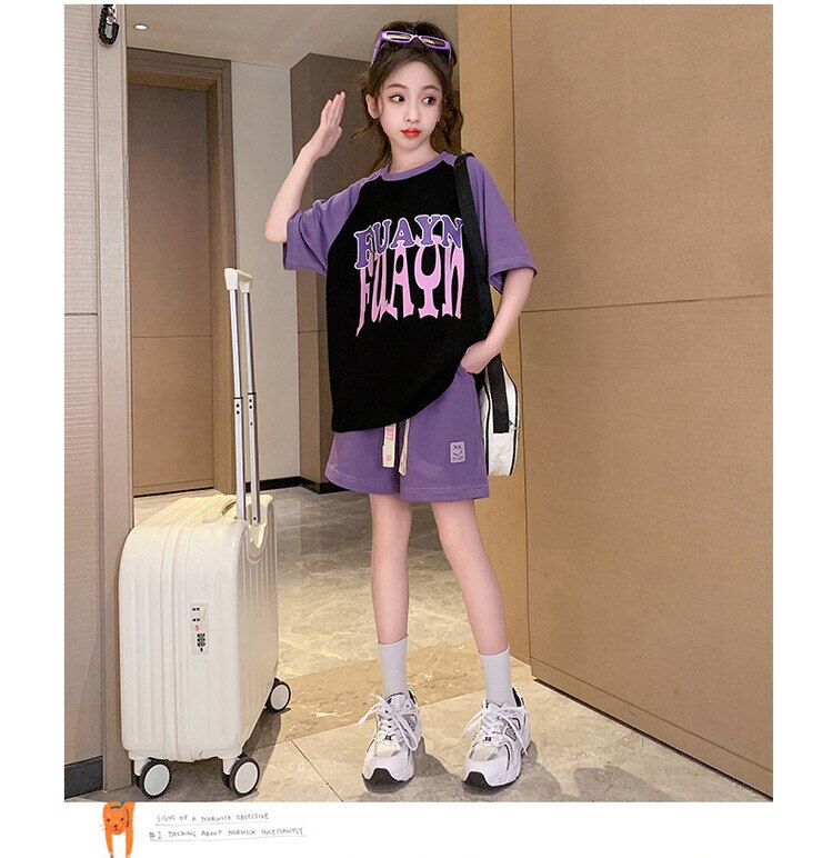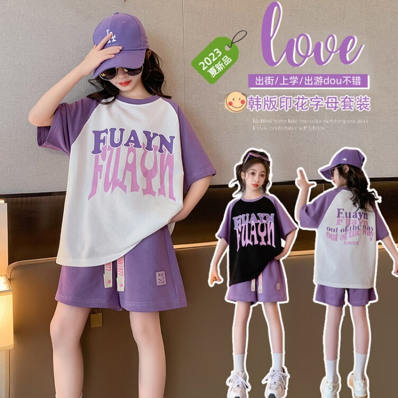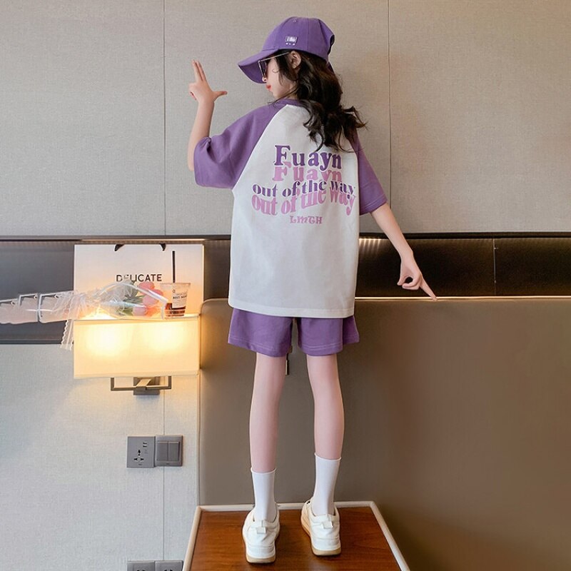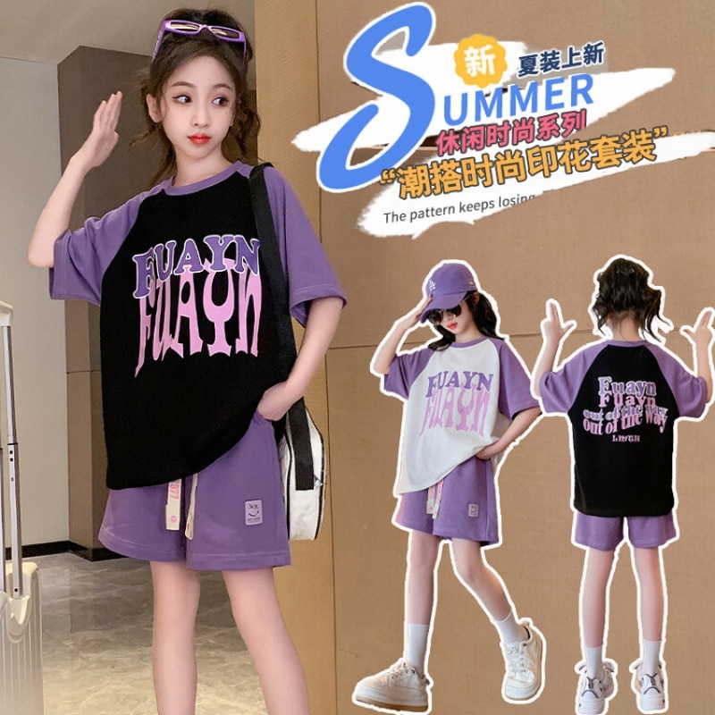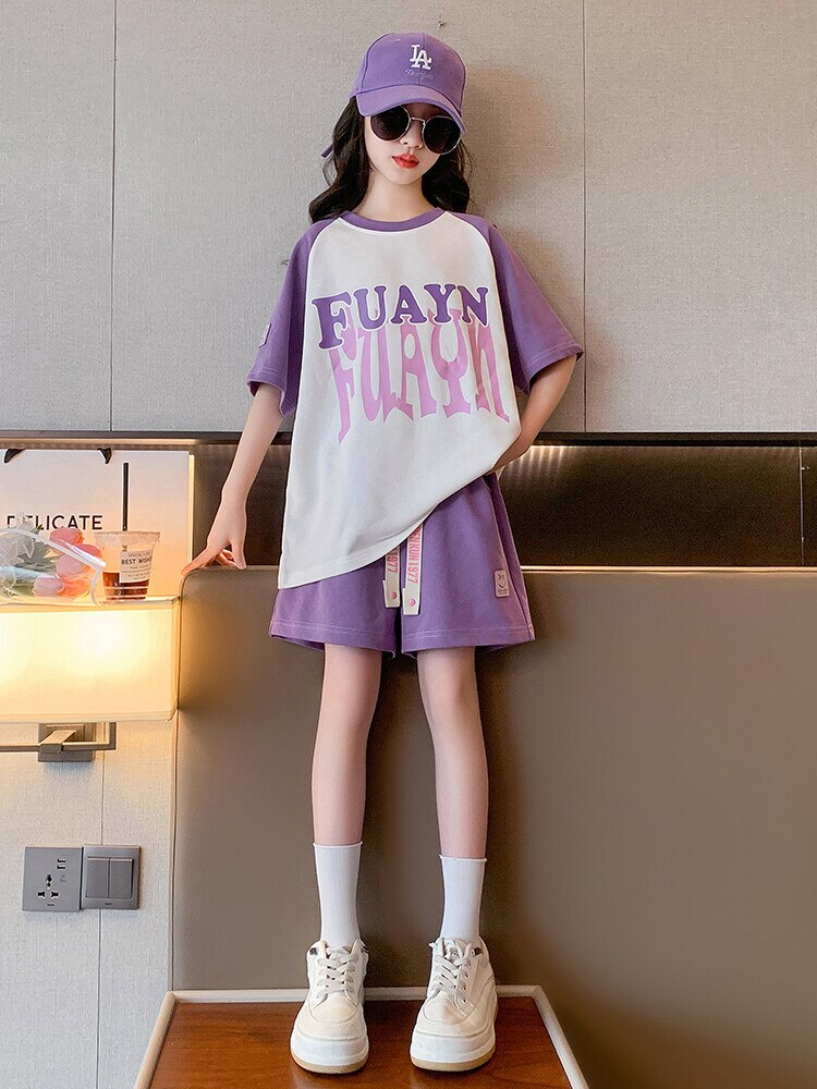 Летний костюм для девочек, шорты с коротким рукавом, комплект из 2 предметов, повседневный СВОБОДНЫЙ Модный костюм в студенческом стиле, детская одежда для девочек, подростков
