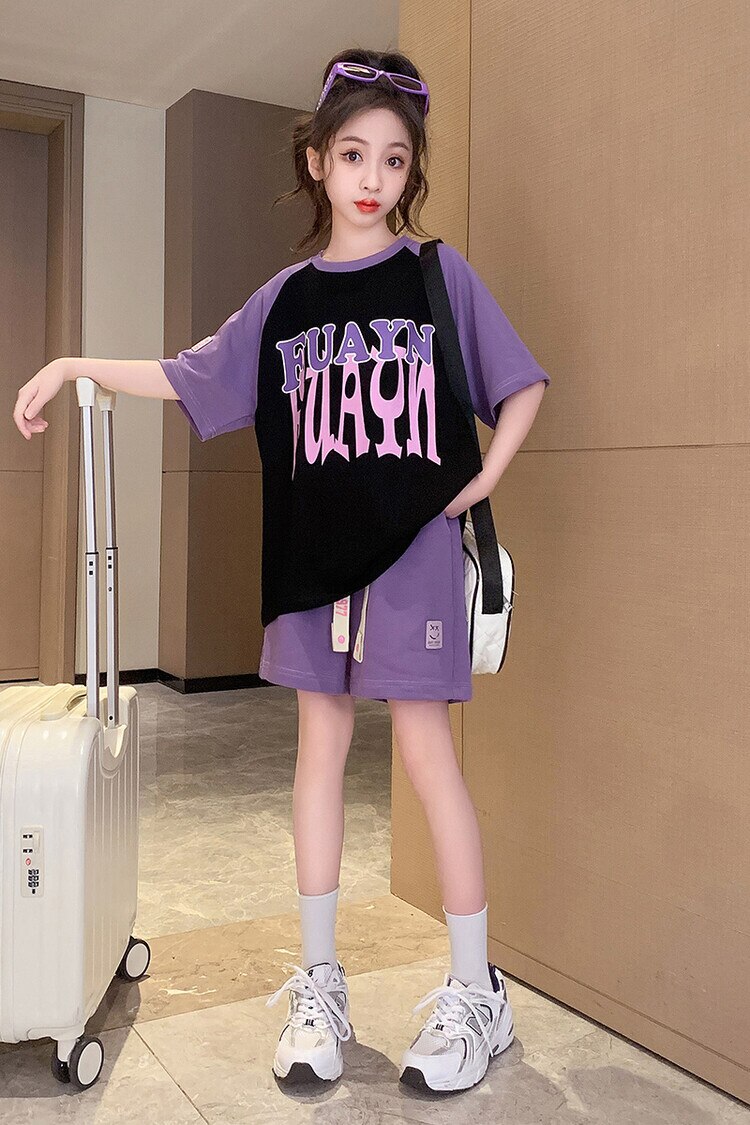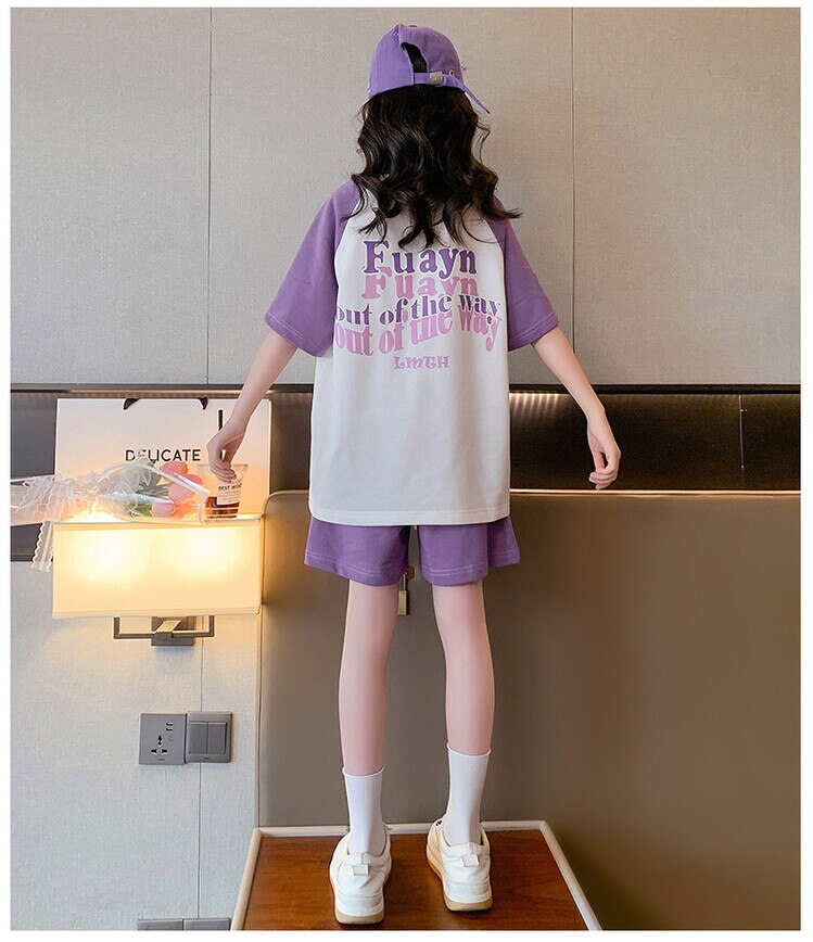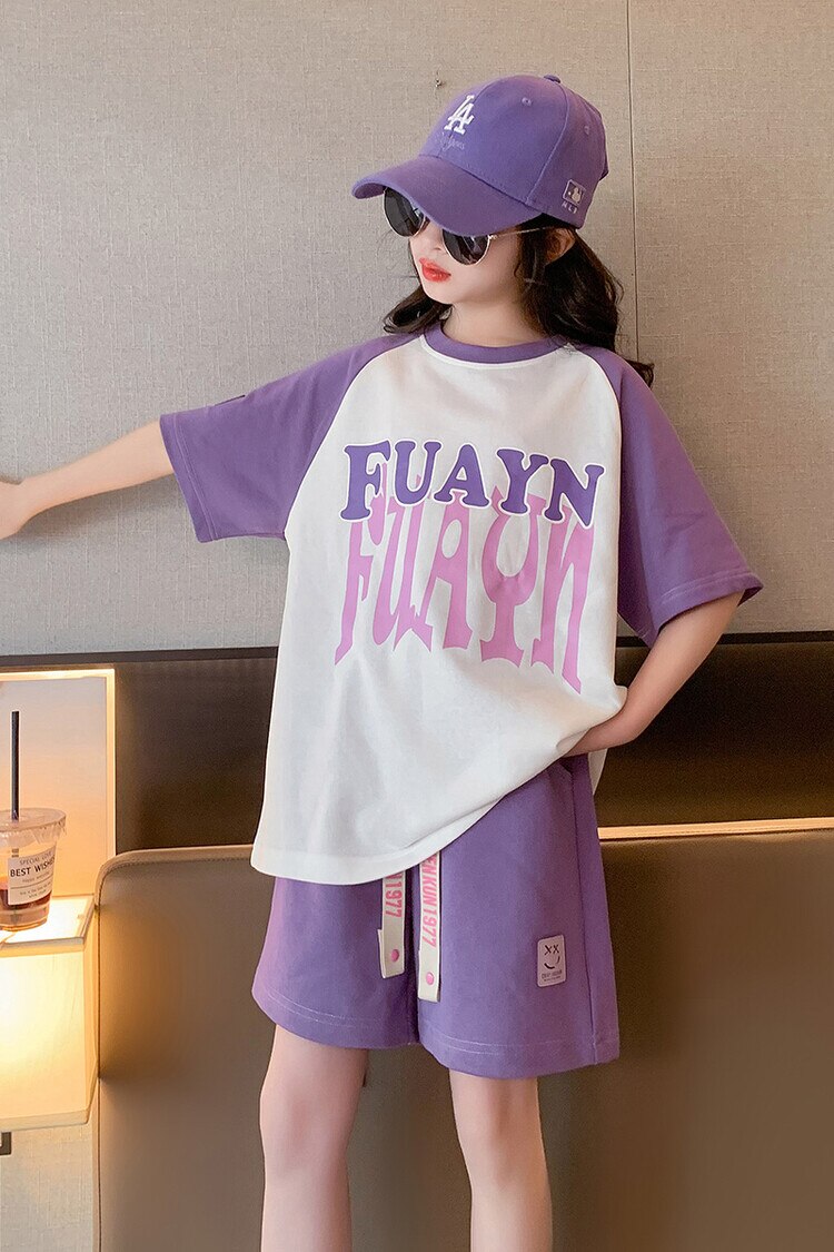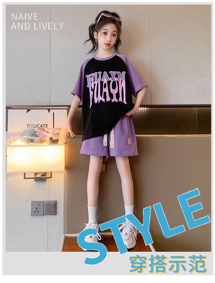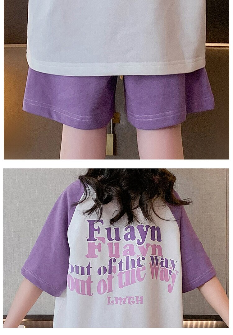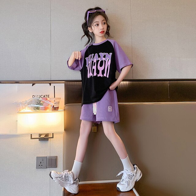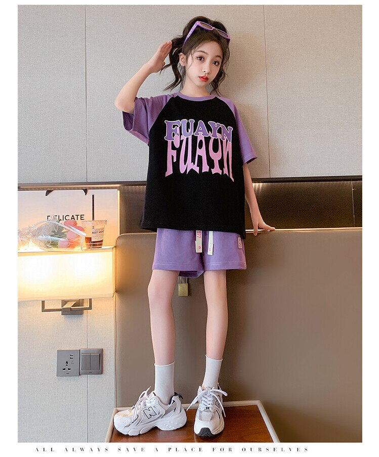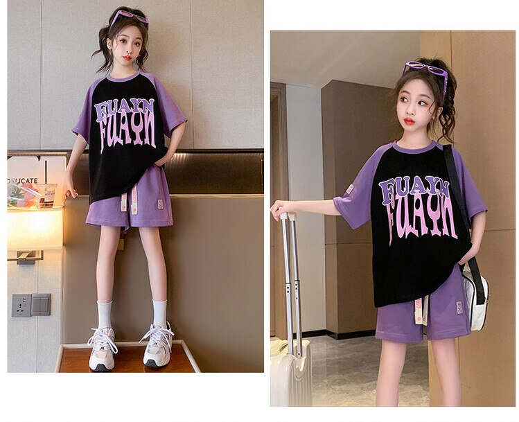 Летний костюм для девочек, шорты с коротким рукавом, комплект из 2 предметов, повседневный СВОБОДНЫЙ Модный костюм в студенческом стиле, детская одежда для девочек, подростков