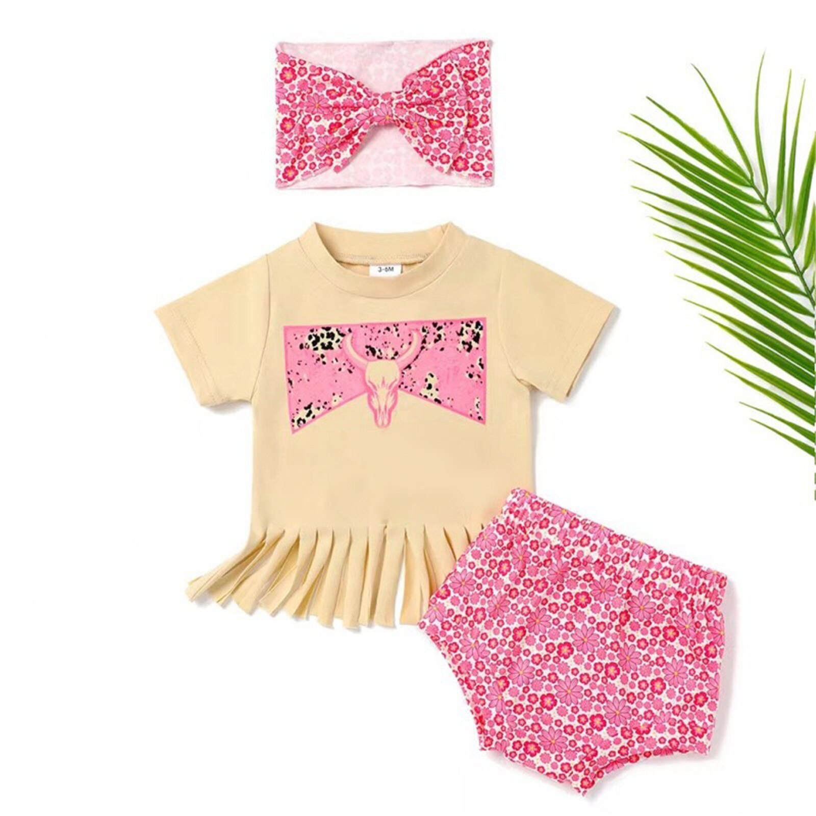 Летний костюм для маленьких девочек, футболка с кисточками с принтом головы коровы, измельченные шорты, розовый костюм с повязкой на голову