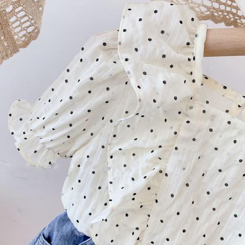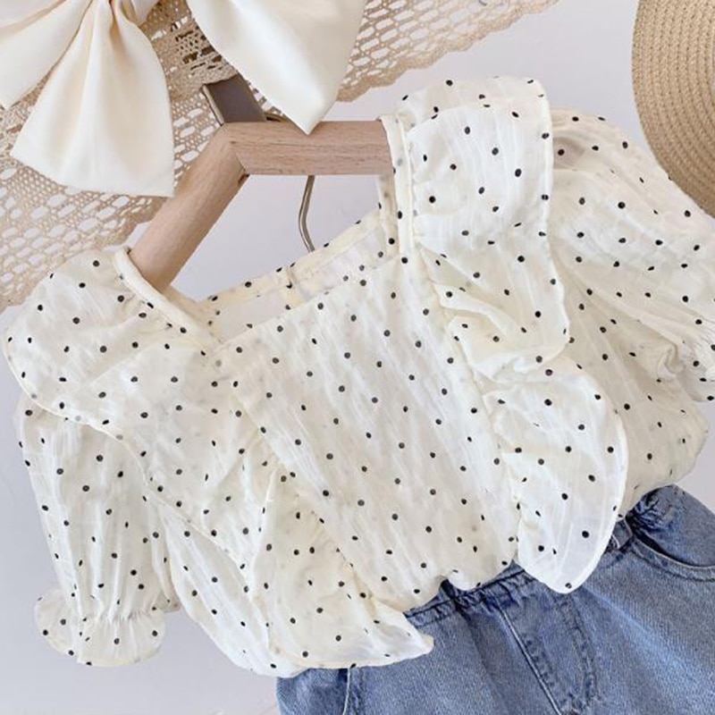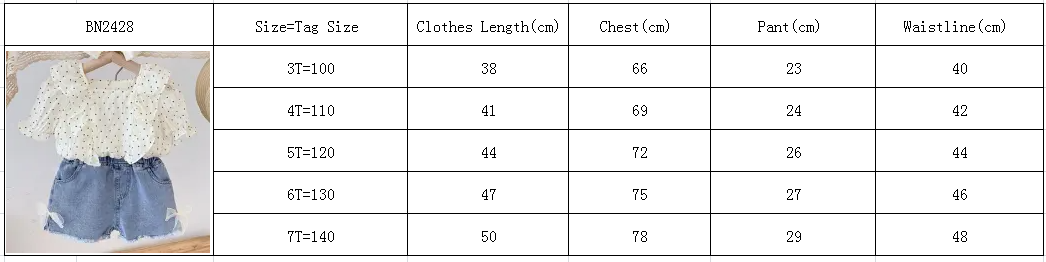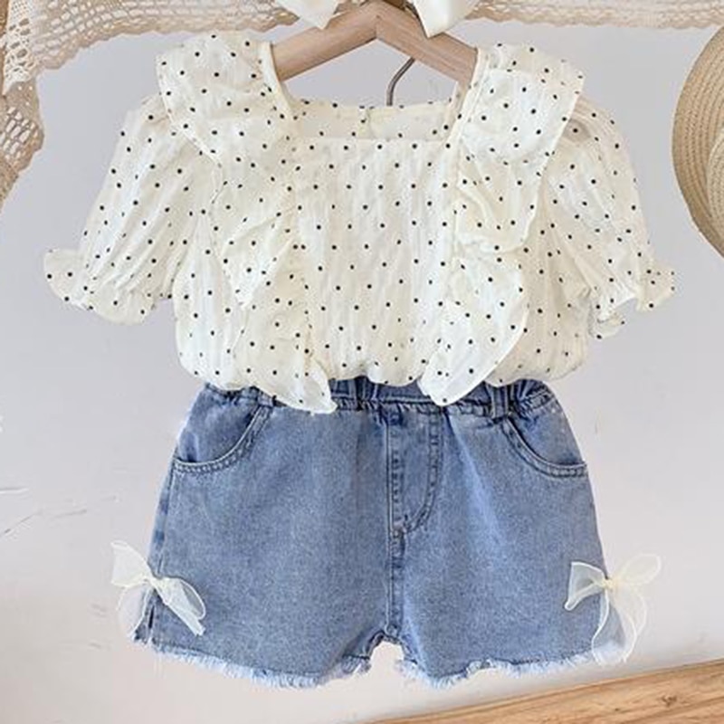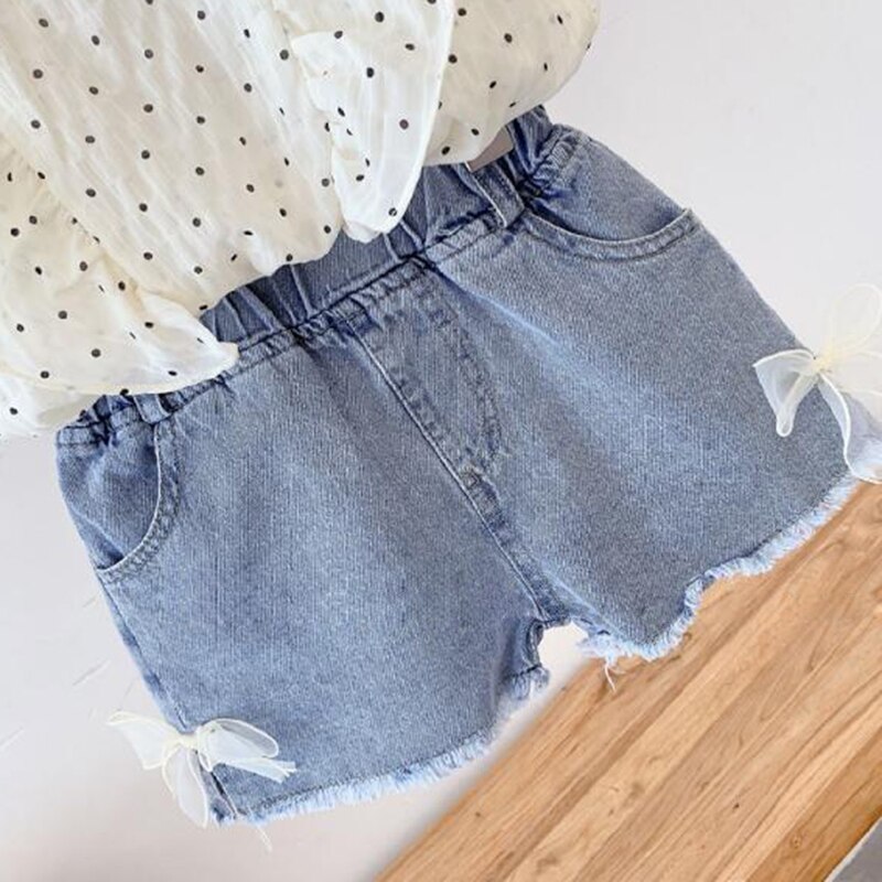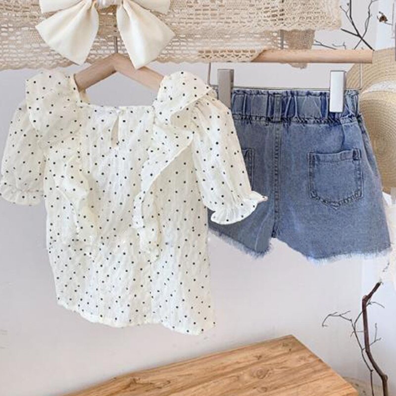 Летний костюм Sodawn 2023 года, рубашка в горошек + джинсовые шорты, повседневный комплект из 2 предметов, детская одежда, комплект для девочек 3-7 лет